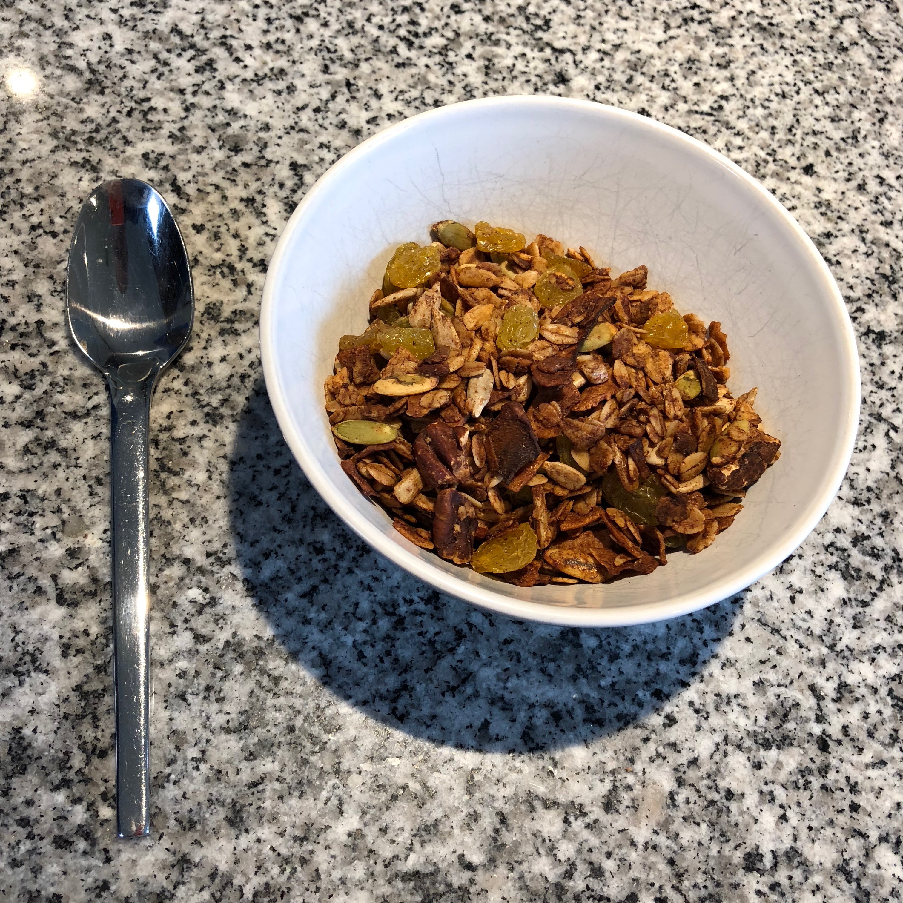 Today I am sharing my granola recipe. It features lot’s of oats, pecan nuts, coconut, pepitas, and sunflower and flax seeds. Plus there are an abundance of spices that make the house smell great long after the baking is done. I have adjusted the amounts of honey and maple syrup down over the years to reduce the total sugar content. The ingredients and step-by-step instructions are listed below with the name brands products that I use where applicable.