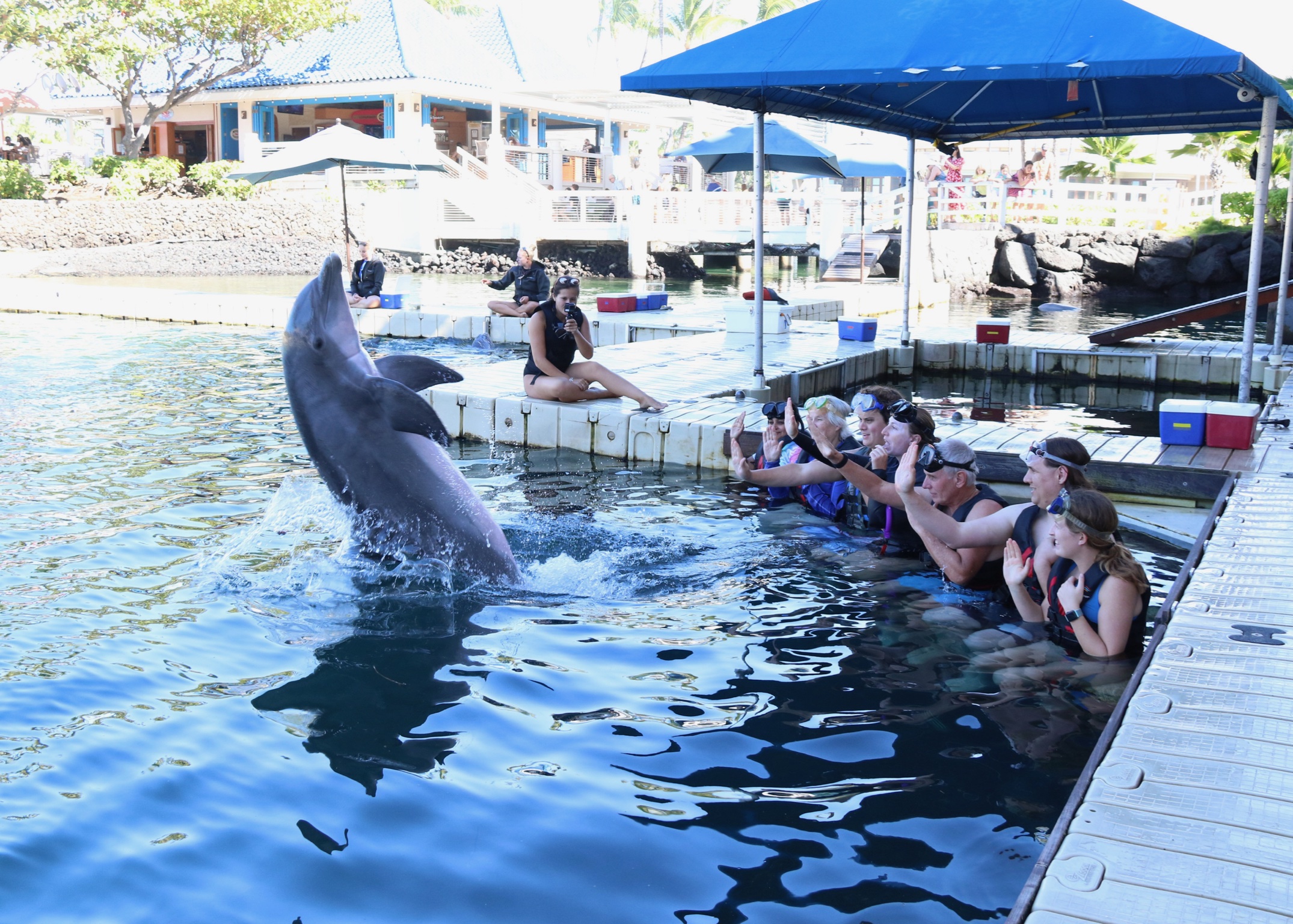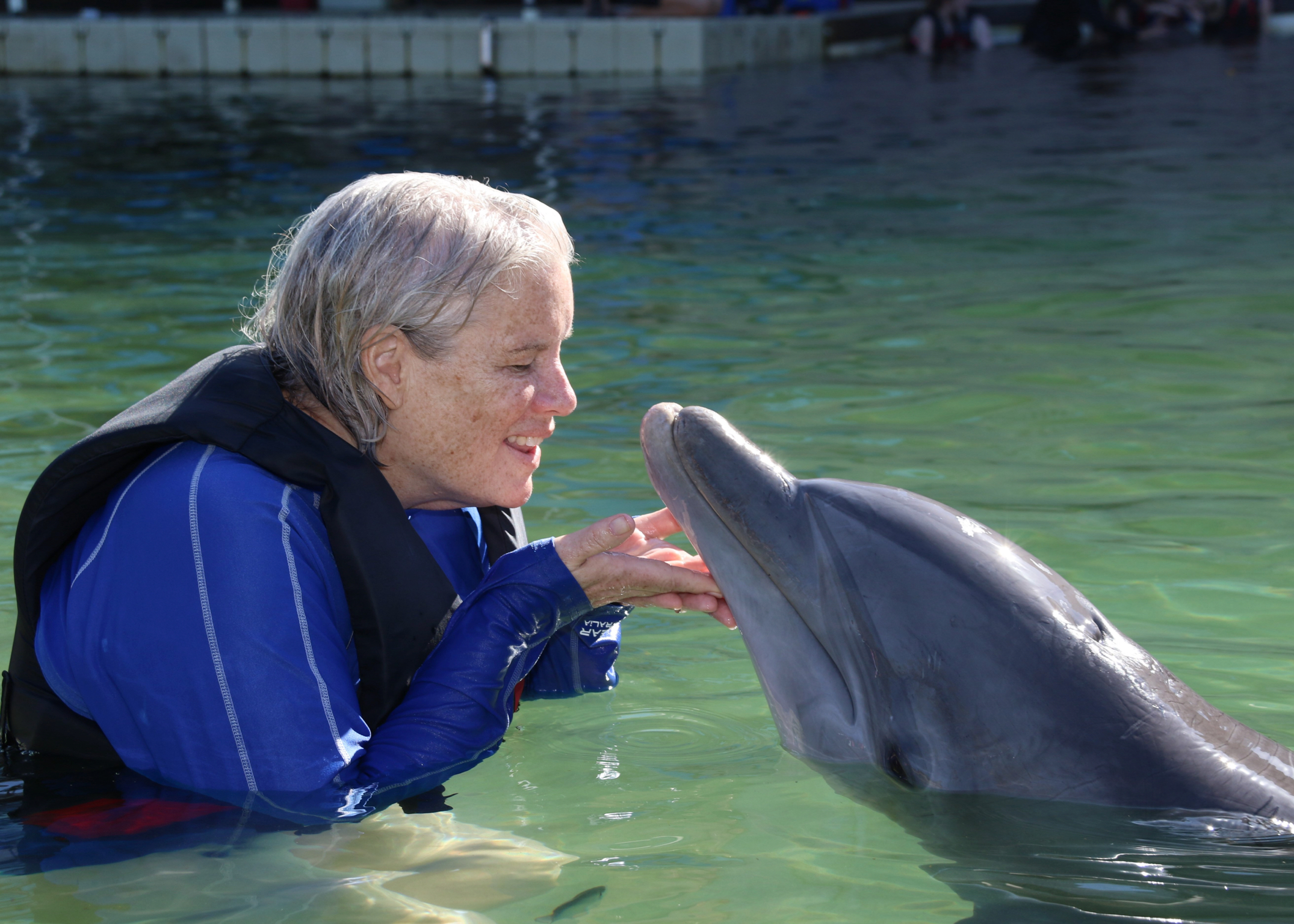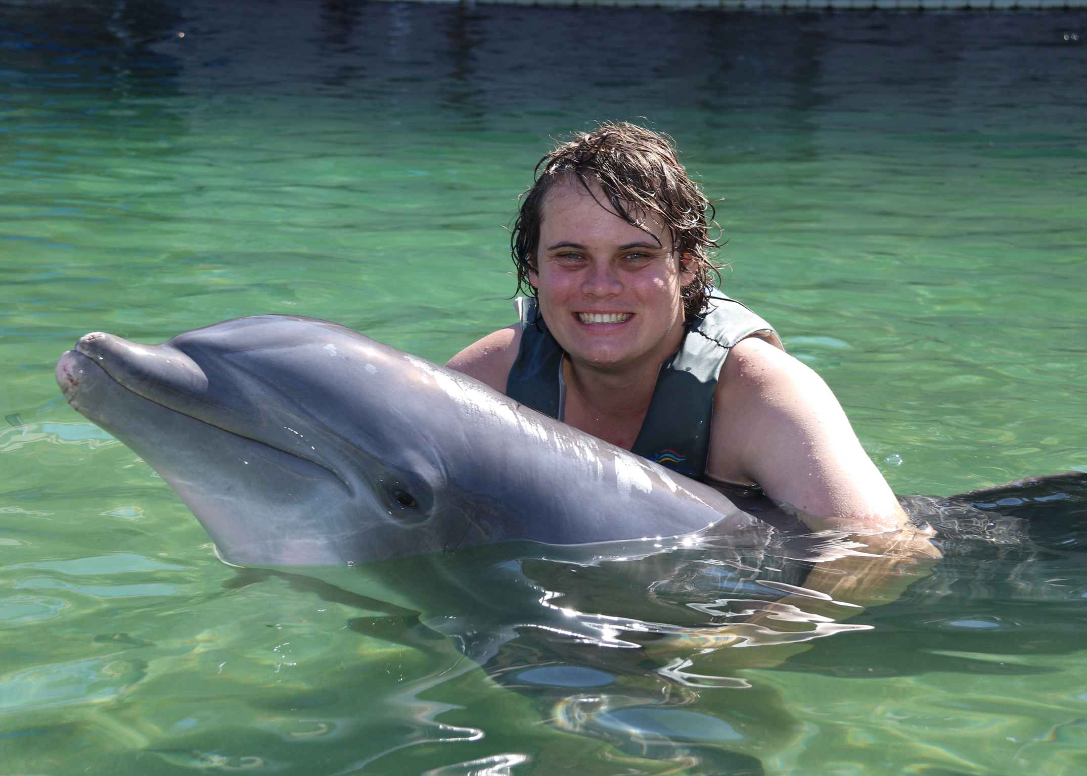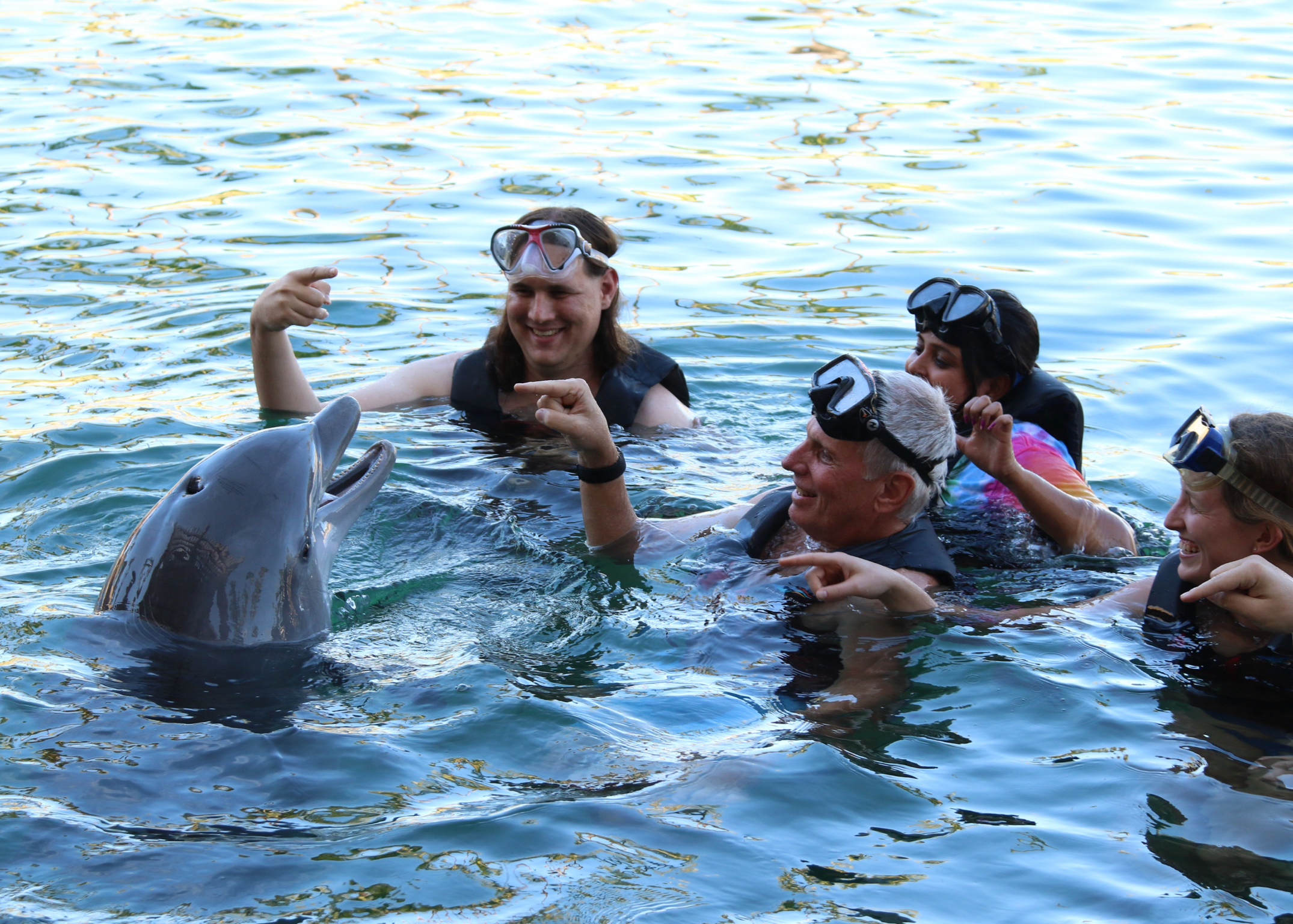 Soon, it was time for us to get ready to go in the water with the dolphins. We were given a quick set of do’s and don’ts when swimming with the dolphins. But our guide, Sarah, soon had us in the water face to face with one of the dolphins. She was really training us to perform the correct signals to elicit the trained behaviors in the animals. You can see in the photos all of us making approximately the same hand gestures. She led us thru encounters with three or four different dolphins of different levels of maturity. We all had a good time and there were lots of pictures taken. All of the animals used were a product of their breeding program.