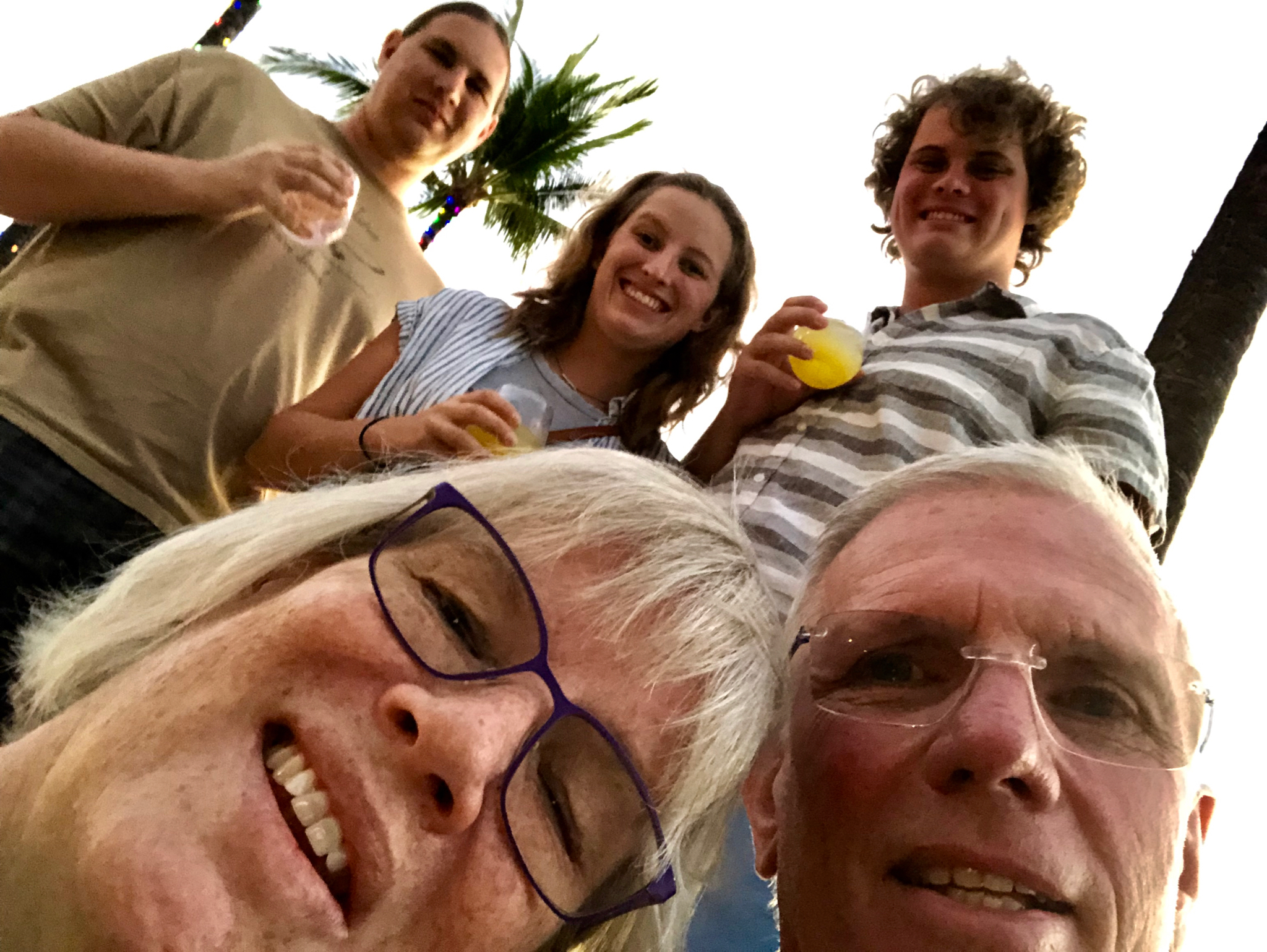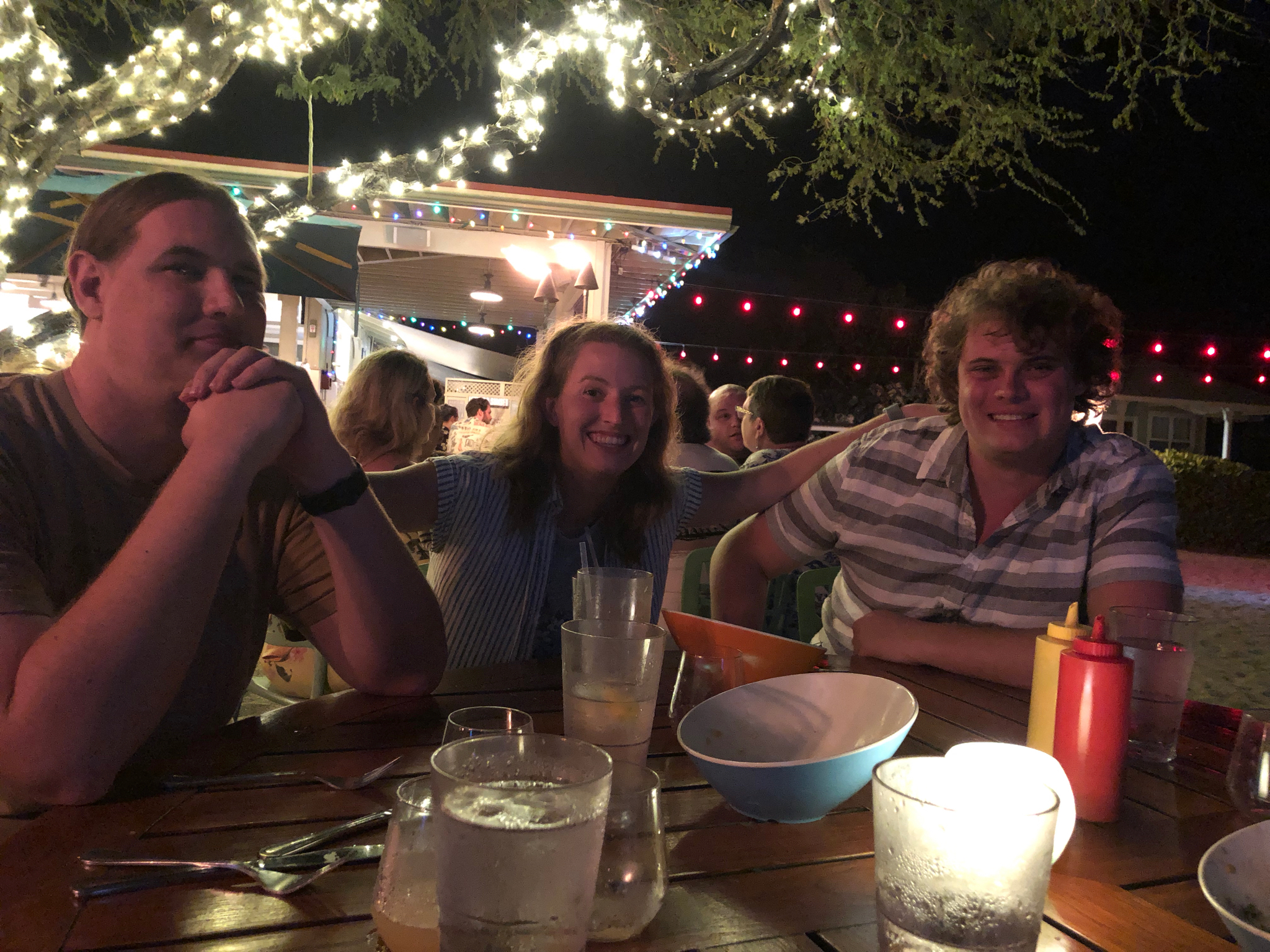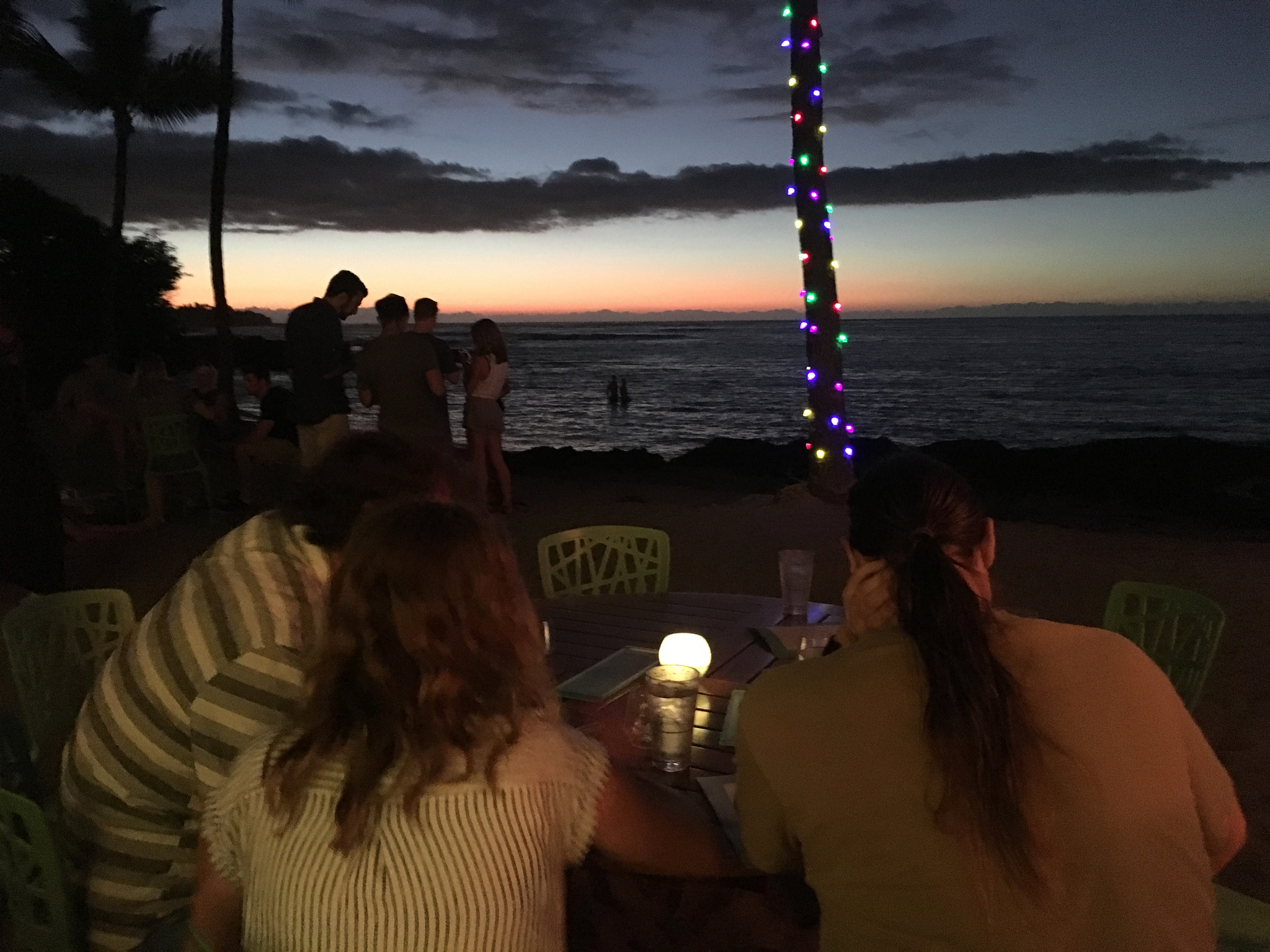 We made our way out of the hotel, back to the golf course, and then to the condo. We now had to start thinking about dinner. Jennifer had recommended a place right on the beach called the Lava Lava Beach Club. They have what I consider to be an enlightened reservation system where you call ahead to get on their waiting list, they then tell you how long the wait will be. This worked great and we were there early enough to get fancy drinks (think little umbrellas and pineapple), walk around a bit seeing the games for people to play, and then be seated right next to the water just before sundown.