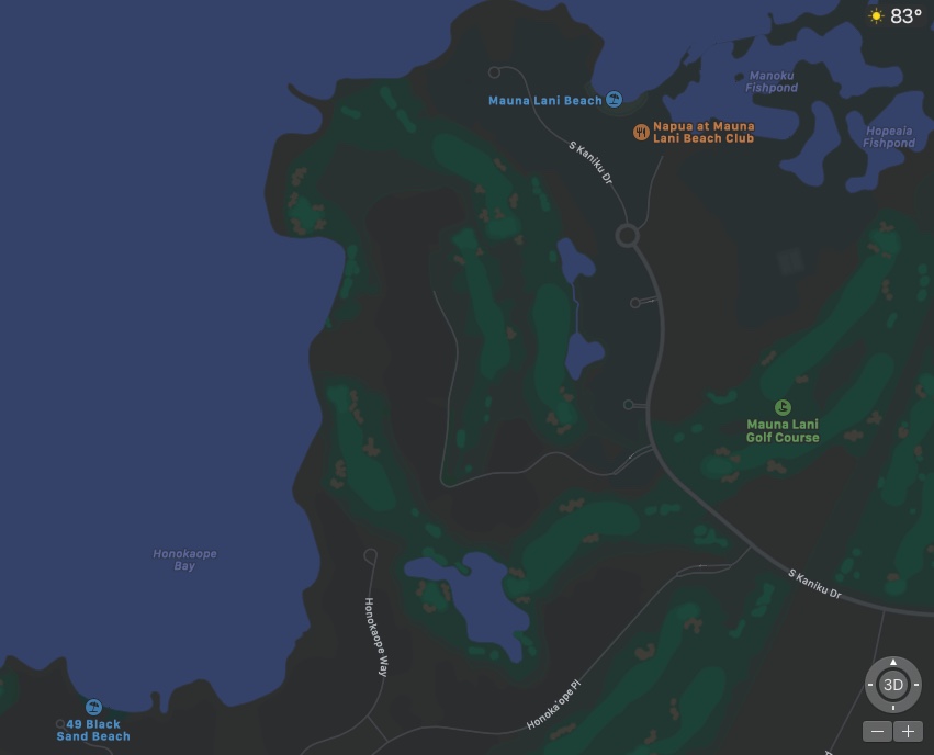 However, the dream was not realized. Unfortunately, there was a swell out of the northwest that was making the conditions suitable for boogie boarding, but not snorkeling. We all got in the water, swam around awhile, and then exited the water. We decided it was time to consult an expert. There was a dive shop nearby called Snorkel Bob’s (Yeah, I got a T-shirt). They quickly pointed us to the Mauna Lani Beach at the top of the map.