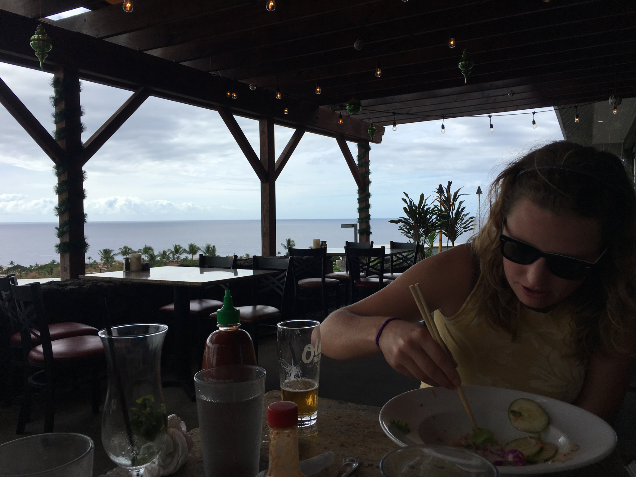 Axel and Megan had been wanting to visit the Kona Brewery, so that was our next stop. We hoped to be able to take the 3pm tour, but it turns out the you need reservations. So instead, we wedged ourselves into a table for two in the bar, and ordered beer. we were disappointed that they were out of several of the beers that were on the menu that we were interested in. But we finally made selections, and ordered a plate of chips and guac to go with. The beers were good, and we had fun sitting in the bar, people watching, talking and eating the chips.