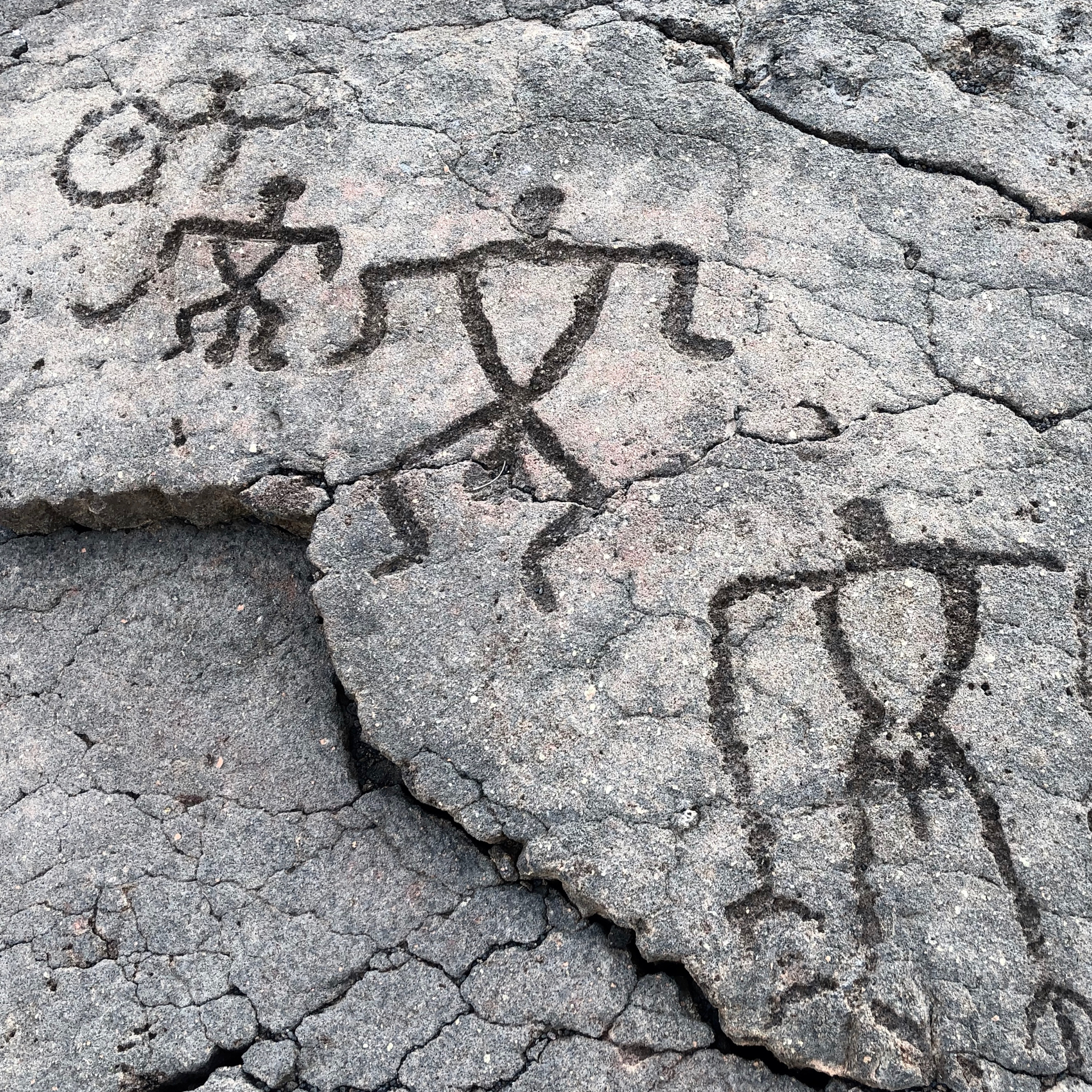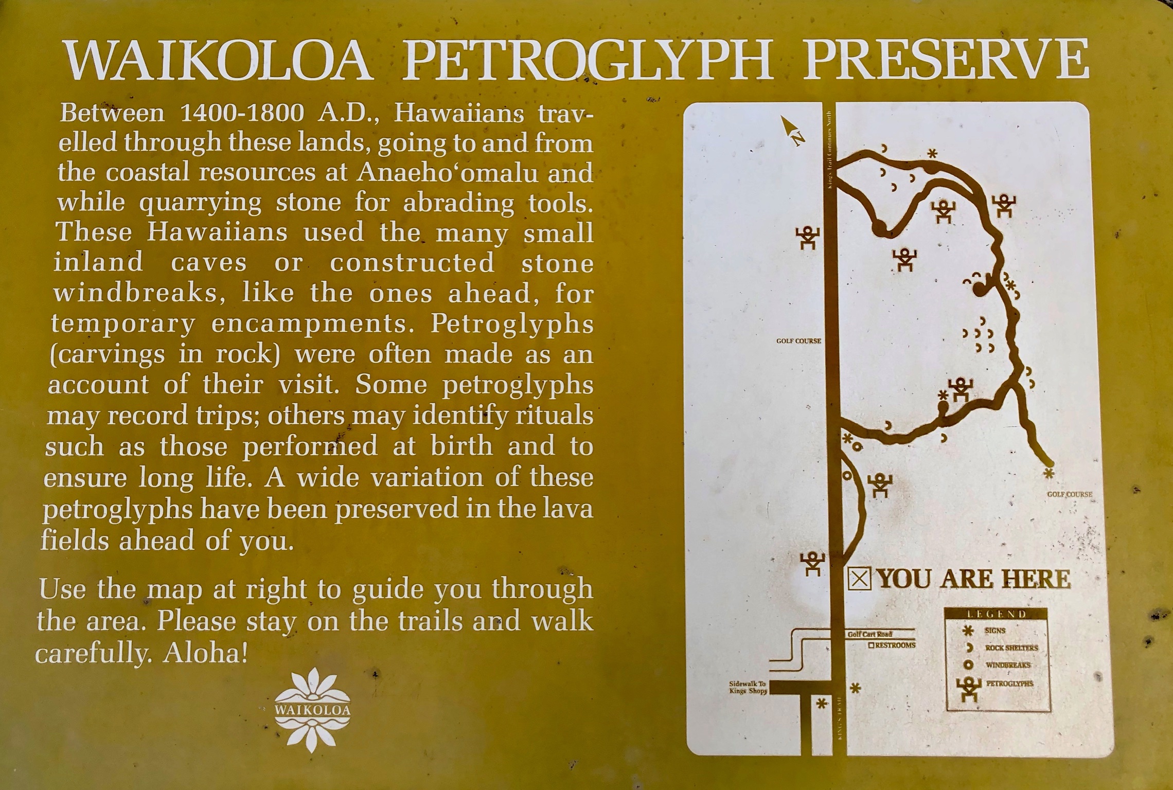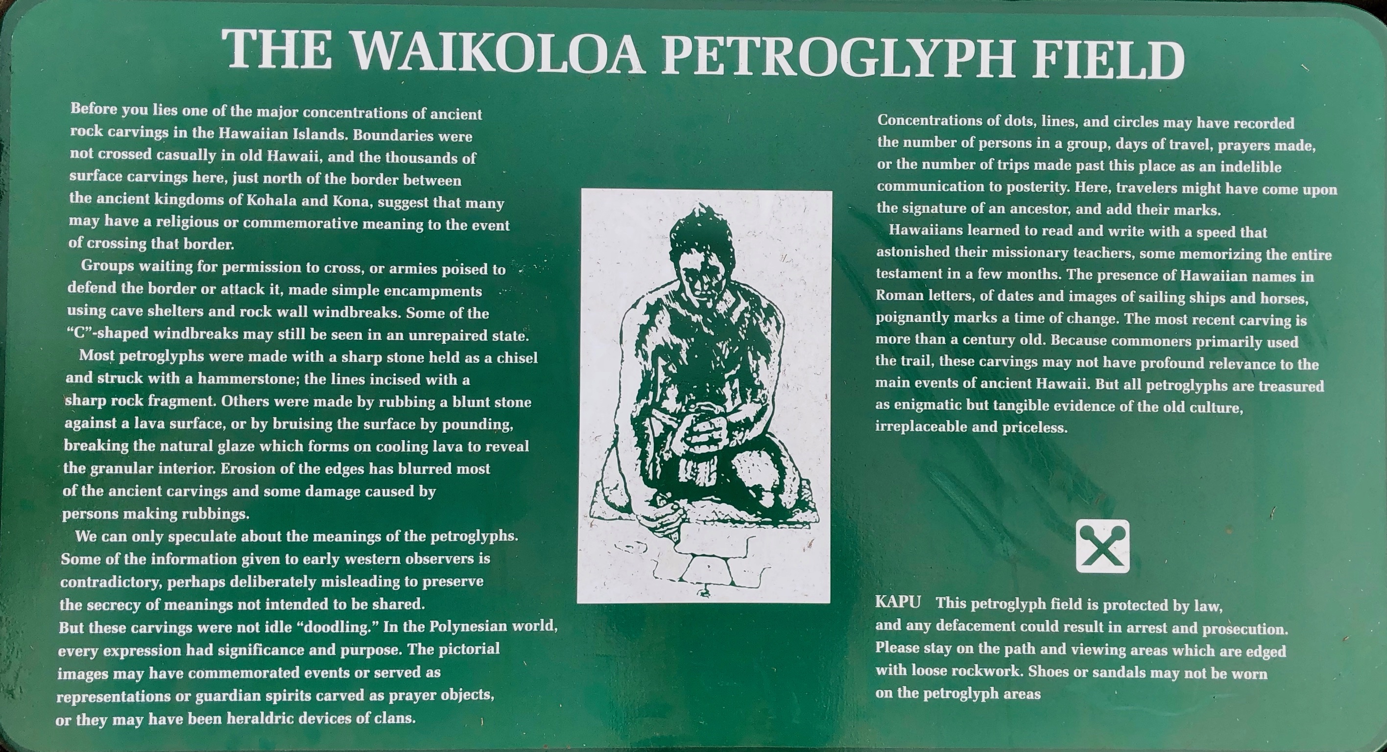 Soon, it was time to head back to the condo. All of us were a little tired. However, this was our last night at the condo before heading to the volcano and we wanted to see the petroglyphs at the nearby Waikoloa Petroglyph Preserve. Once there, we set out for the short hike around the preserve. There were lots of petroglyphs but not a lot of interpretation. So we were left to our own imaginations.