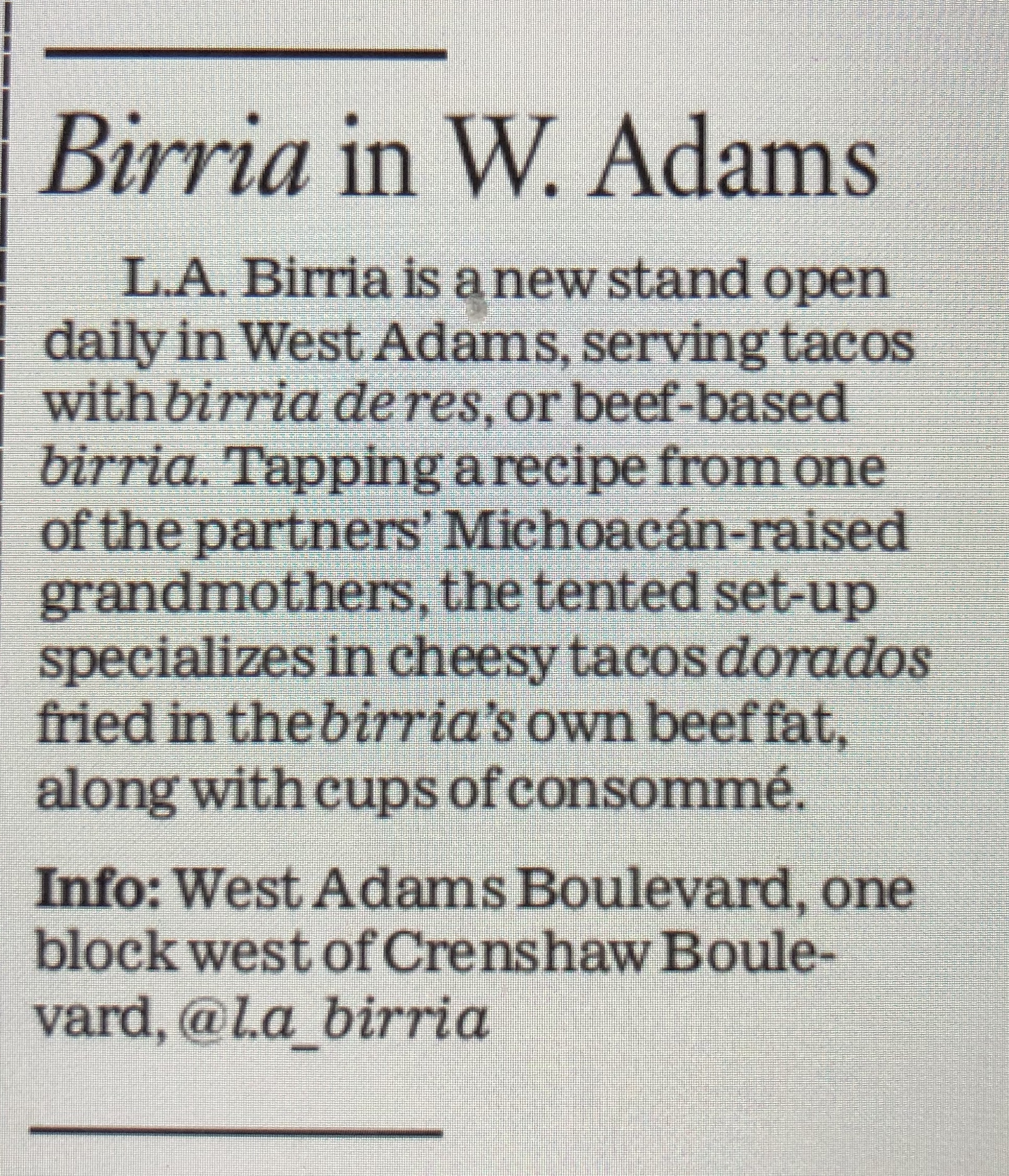 A friend and I periodically get together for lunch on Fridays. Today was my day to pick and I picked L.A. Birria. It is a small lunch stand on West Adams just west of Crenshaw. The selection was solely based on a small article I saw in the LA Times a week ago.
