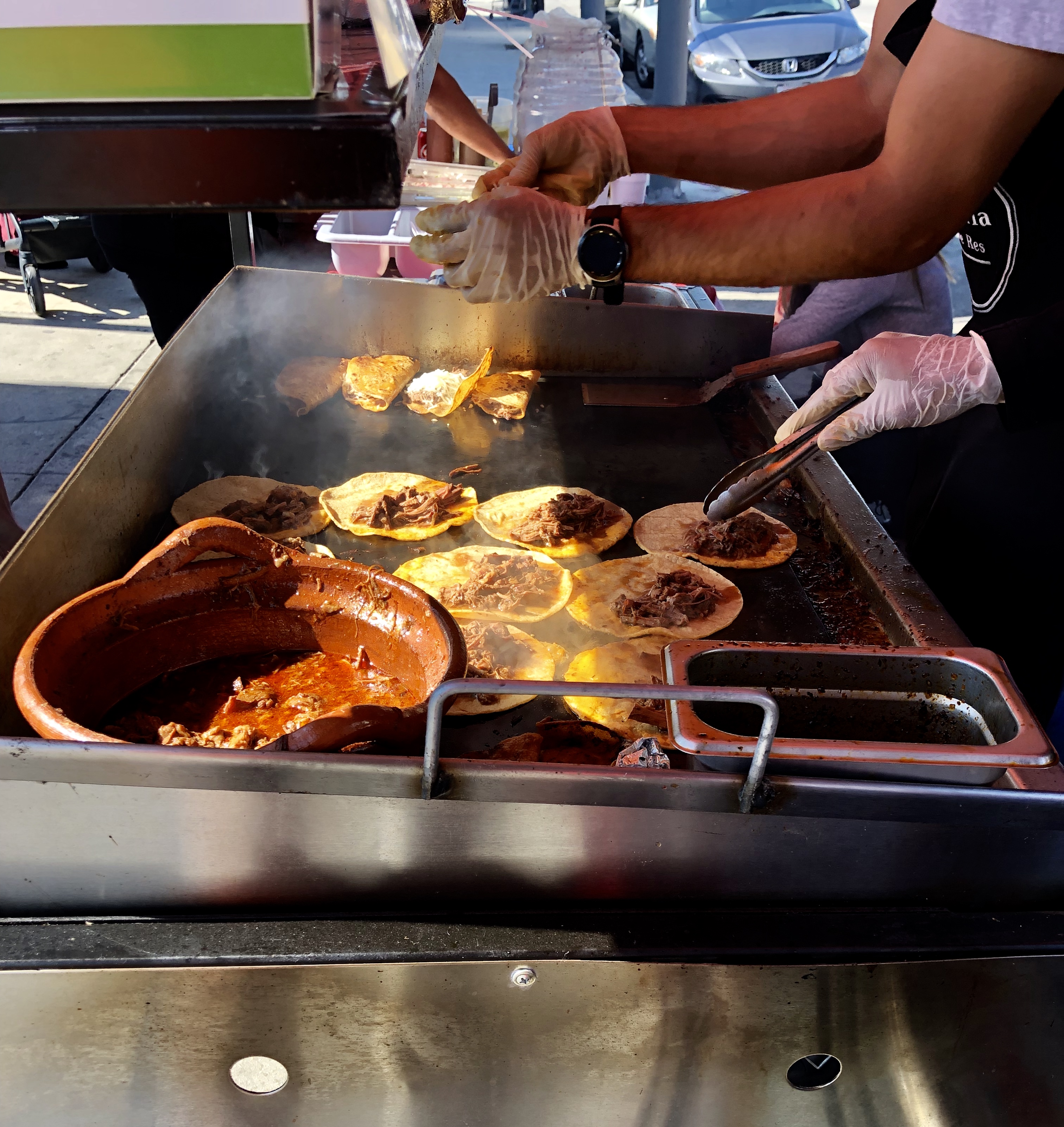 L.A. Birria turns their Birria into savory street tacos, featuring beef (not goat, my mistake). The taco shells are fried on the griddle in fat from the stew, loaded with meat, and/or cheese, and/or grilled onions. Chef Eduardo, and his partner Kevin manned the grill. and the Chef’s wife Ariadna cheerfully took our money.