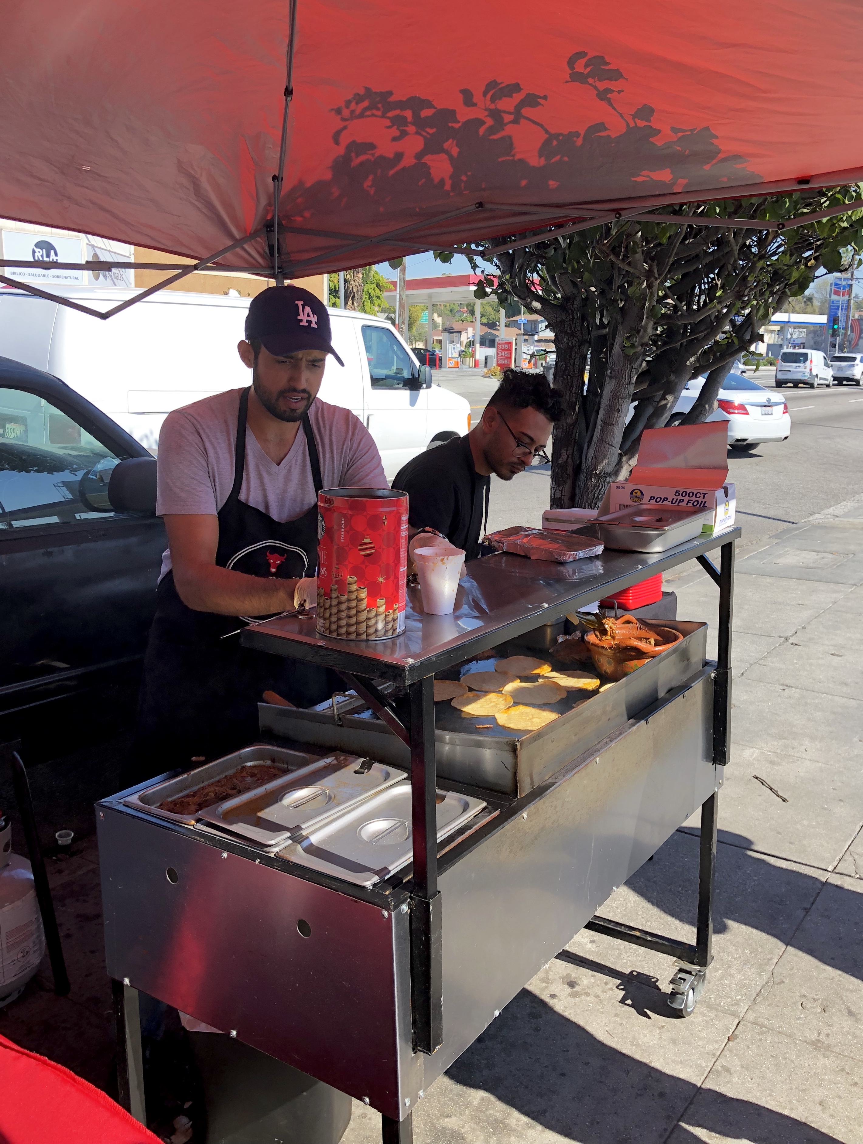 L.A. Birria turns their Birria into savory street tacos, featuring beef (not goat, my mistake). The taco shells are fried on the griddle in fat from the stew, loaded with meat, and/or cheese, and/or grilled onions. Chef Eduardo, and his partner Kevin manned the grill. and the Chef’s wife Ariadna cheerfully took our money.