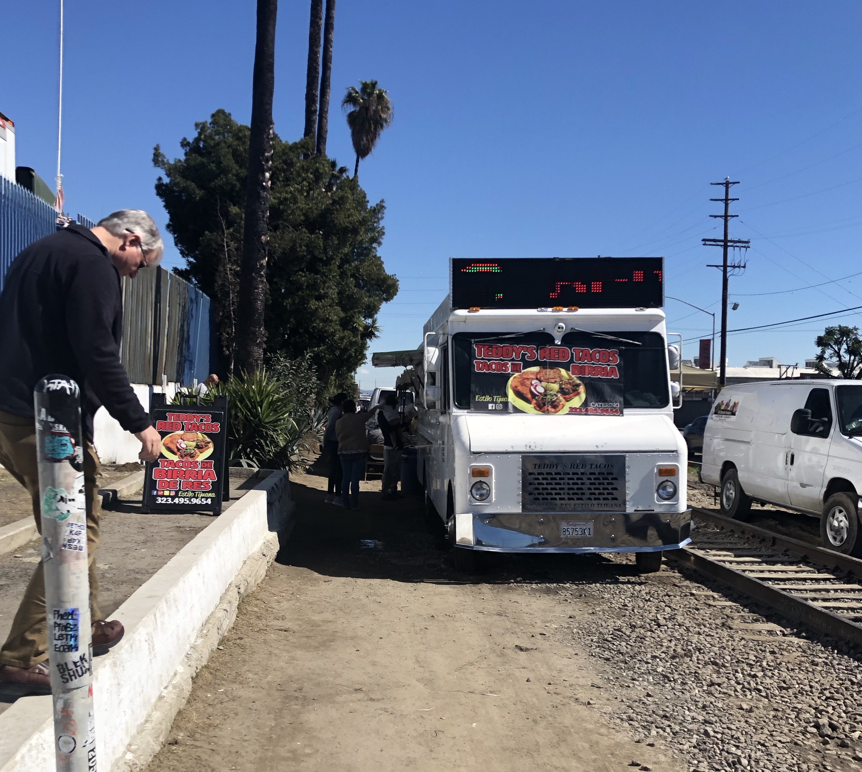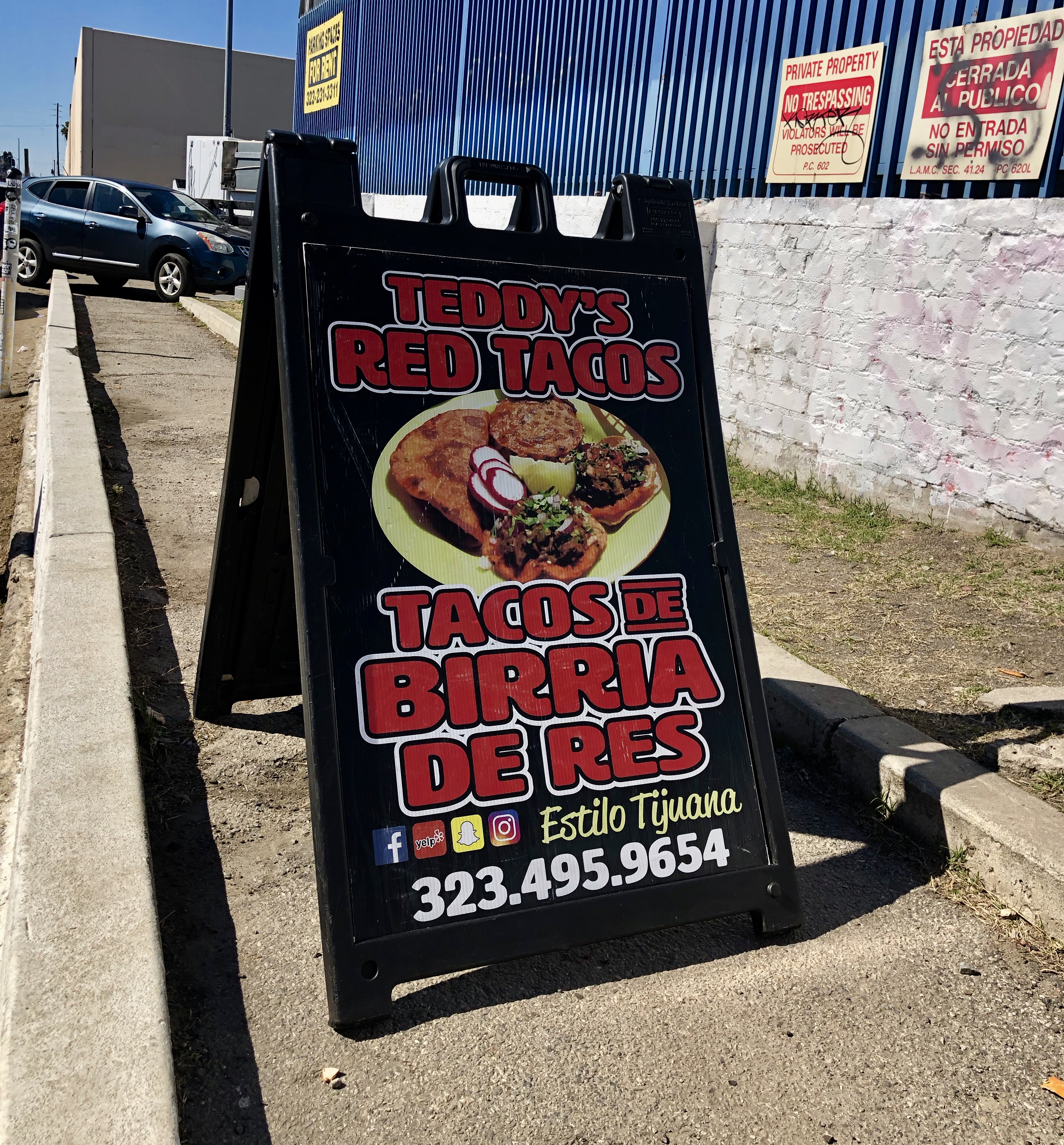 Chasing good Mexican food across the LA basin can take you to tables in unusual locations. Today’s hot spot is Teddy’s Red Tacos. Teddy’s is taking advantage of an apparently unused section of land, on the railroad tracks that parallel Slauson Boulevard, in Los Angeles. They specialize in Birria tacos and related dishes.