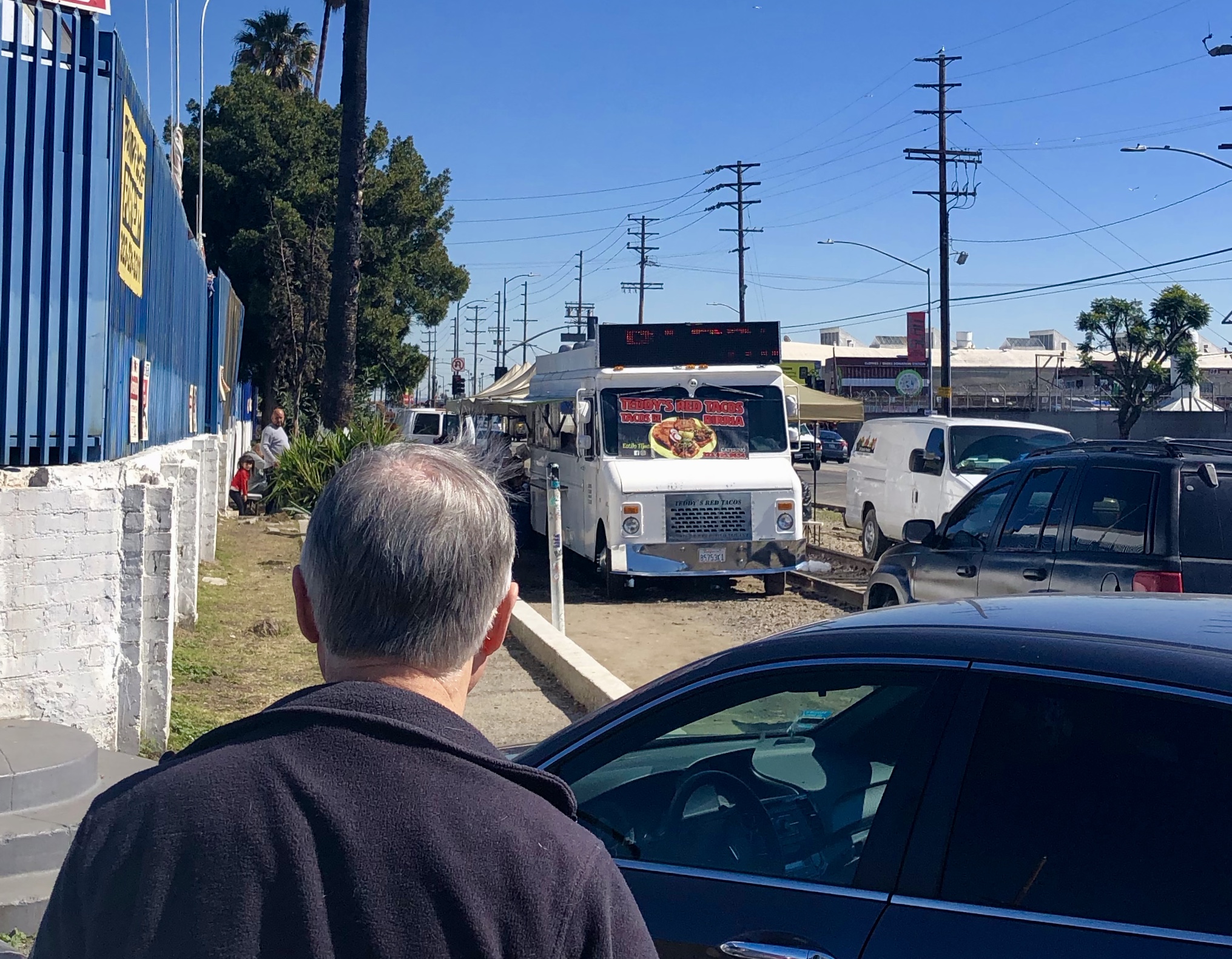 The address is 731 East Slauson, but there is no building there. Just a White lunch truck surrounded by people and flanked at one end with easy-ups covering tables with chairs. We parked along MacKinley where there were parking spots at the end of the street.