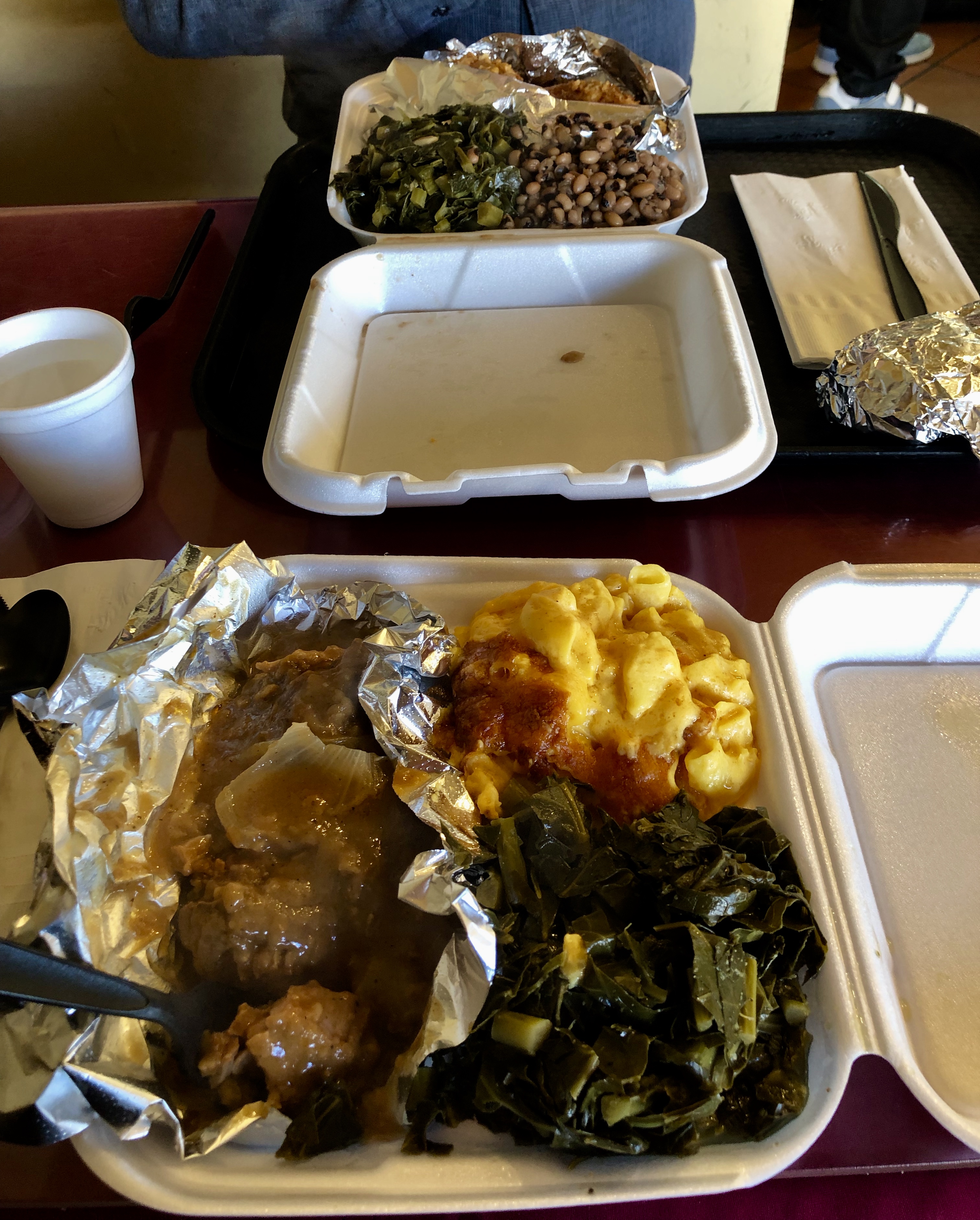 I quickly scanned the menu and settled on smothered pork chops, collard greens, and mac and cheese. Steve ordered the fried chicken, beans, and collard greens. Each order was placed into a styrofoam container and as I checked out at the cash register, I added peach cobbler to my order (Steve abstained dessert). I really have to try the ox tails next time.