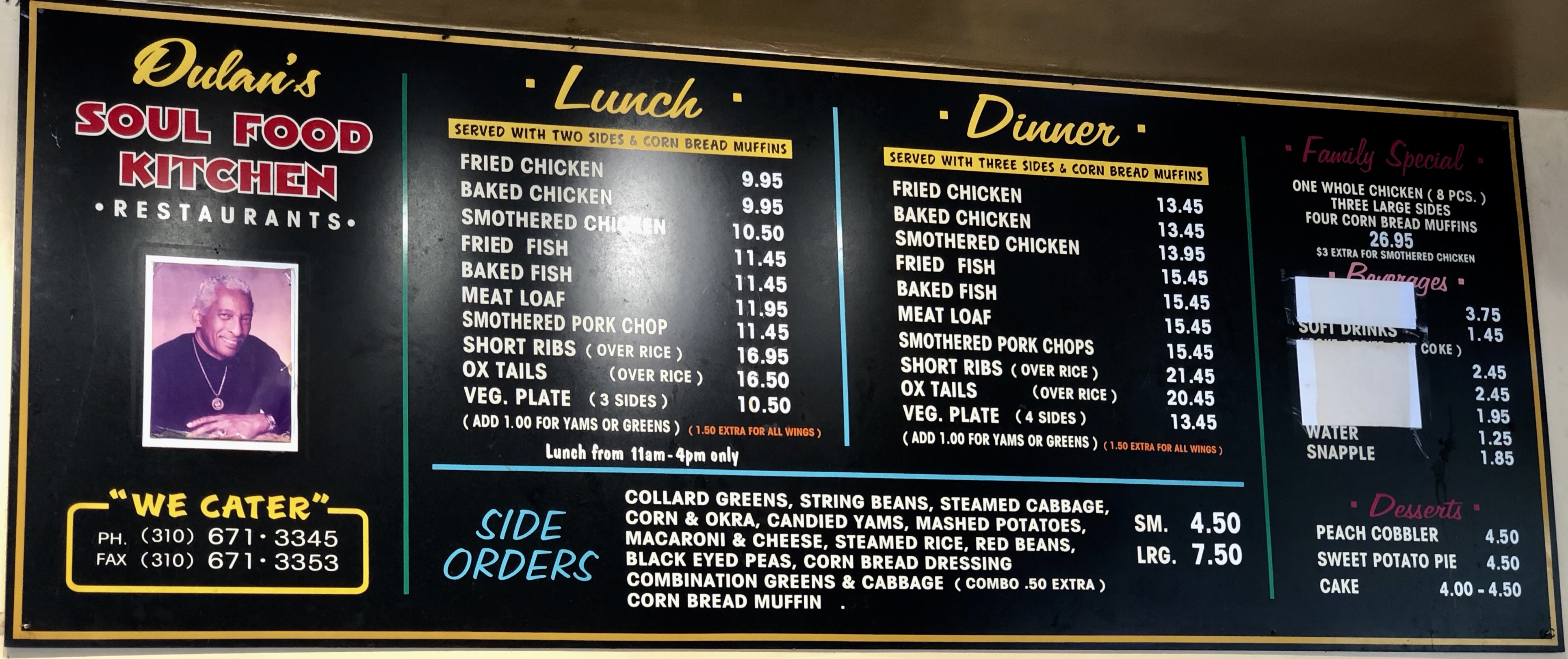 I found Dulan’s on the internet. I googled “Soul Food” and 3 places popped up. I’m sure there are more, but the place with the best reviews was Dulan’s Soul Food Kitchen. Dulan’s has two locations, one on Manchester in Inglewood, and one on Century in Los Angeles.