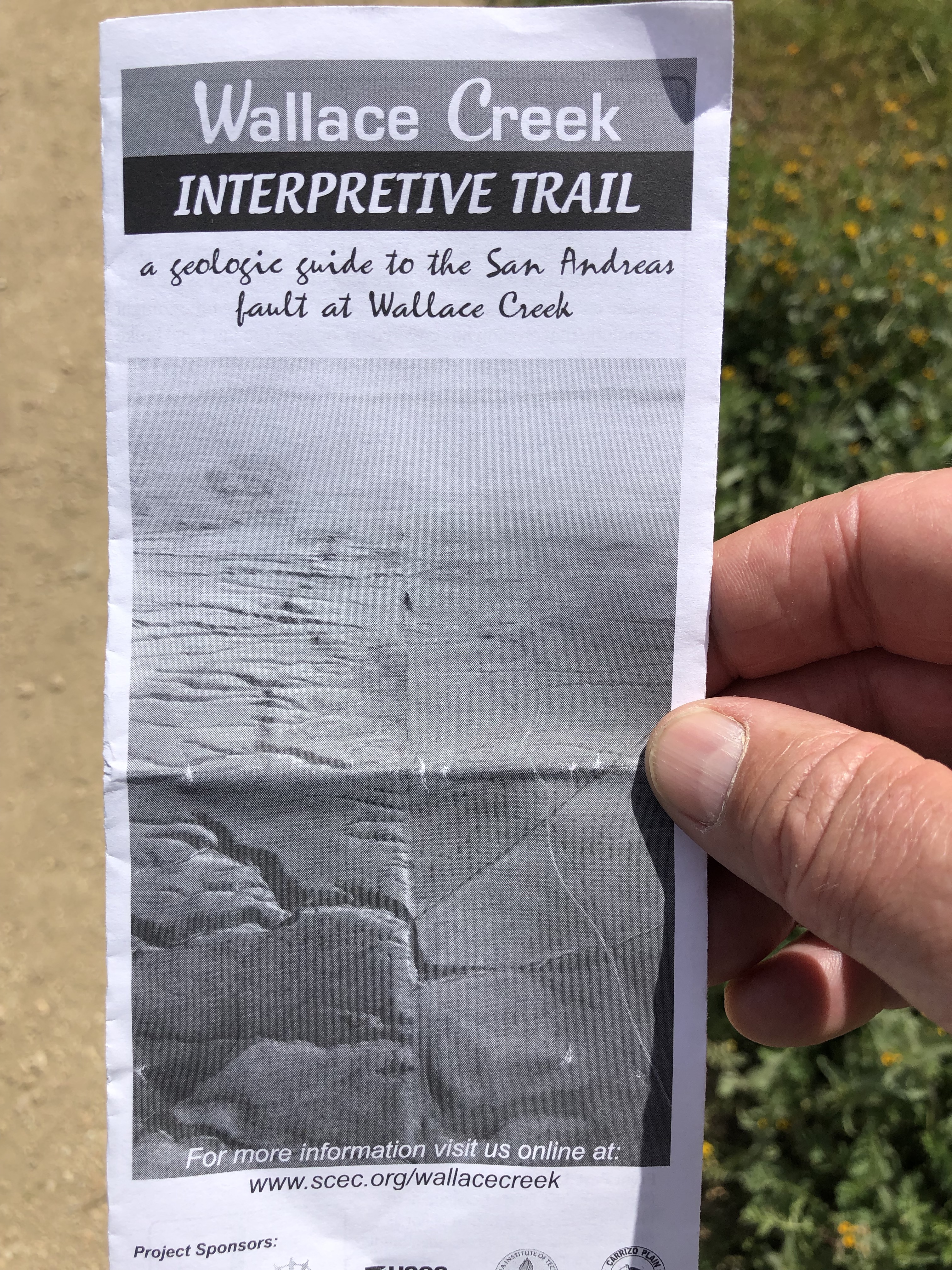 It is there that we found our next destination. The San Andreas Fault (the interface between the North American Plate and the Pacific Plate) runs northwesterly through the National Reserve. A short drive away, was Wallace Creek. The creek crosses the fault and you can see the physical evidence of fault movement. It was hard to get a usable picture here, so this picture of the brochure will have to do. The creek displacement can be seen below the fold.