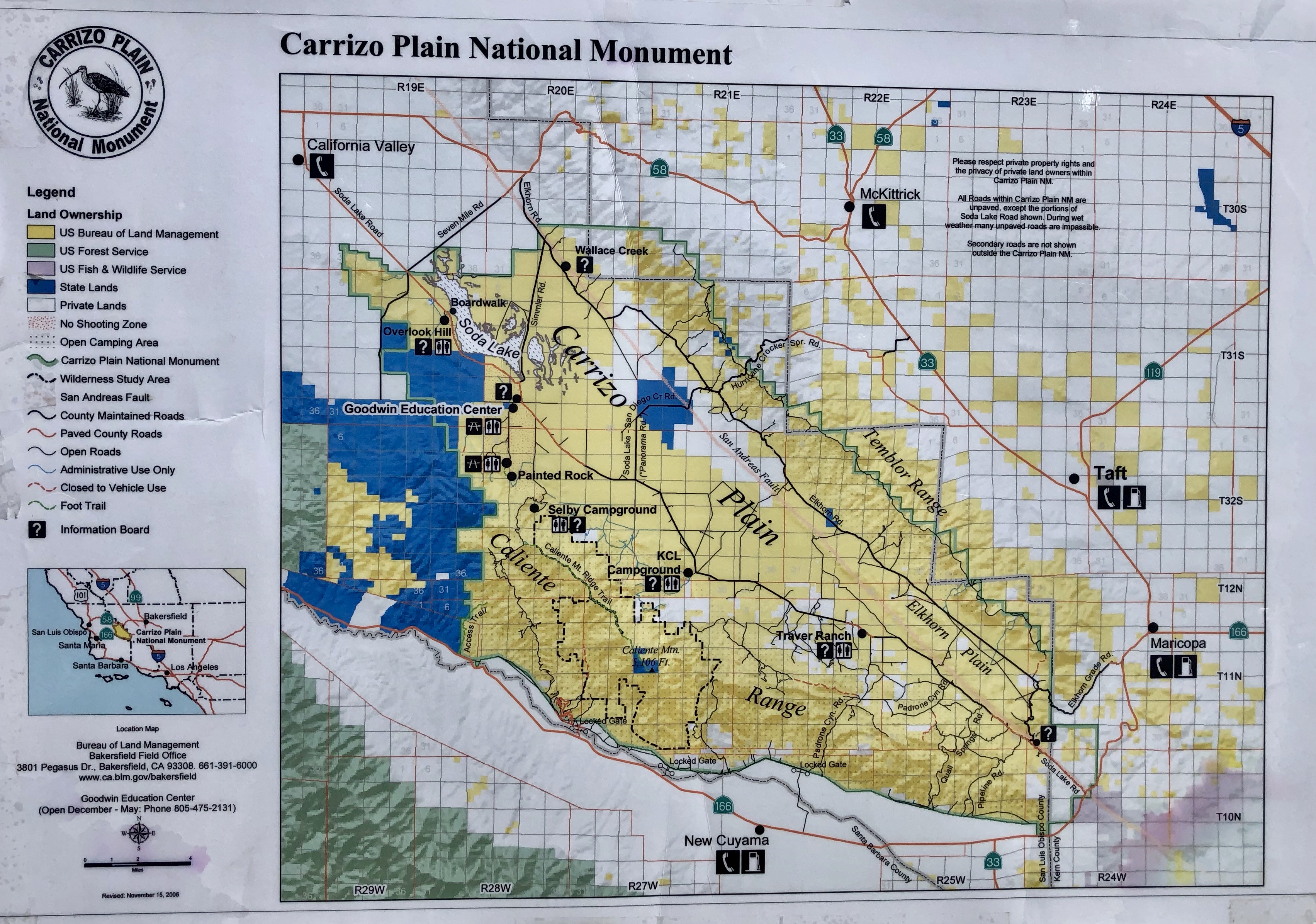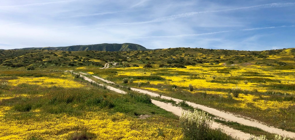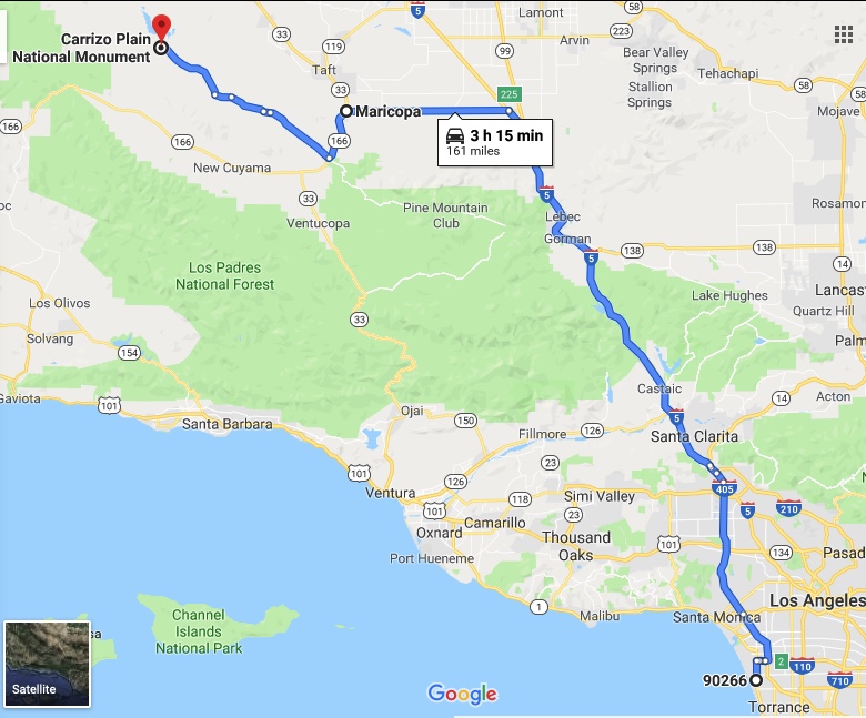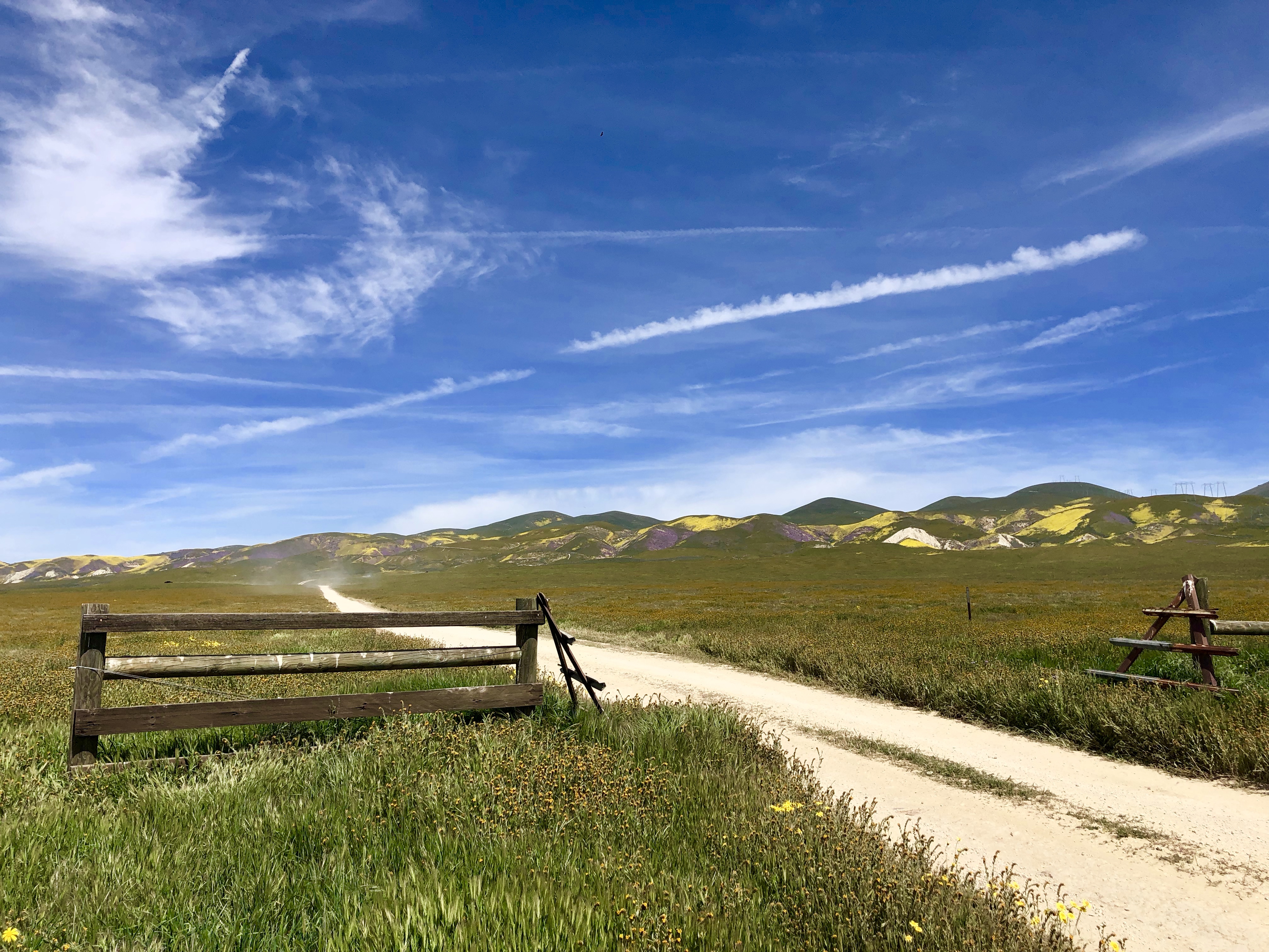 Anyway we were on the road around 6:30 and heading towards Gorman and the Grapevine pass. It’s unusual for us to go up Highway 5 instead of the 101. But this trip, we are in search of super-blooms that have sprouted courtesy of the historic rains California experienced this winter. Specifically, our route (as recommended by Barb, Gretchen’s mom) was designed to pass through the Carrizo Plains National Monument.