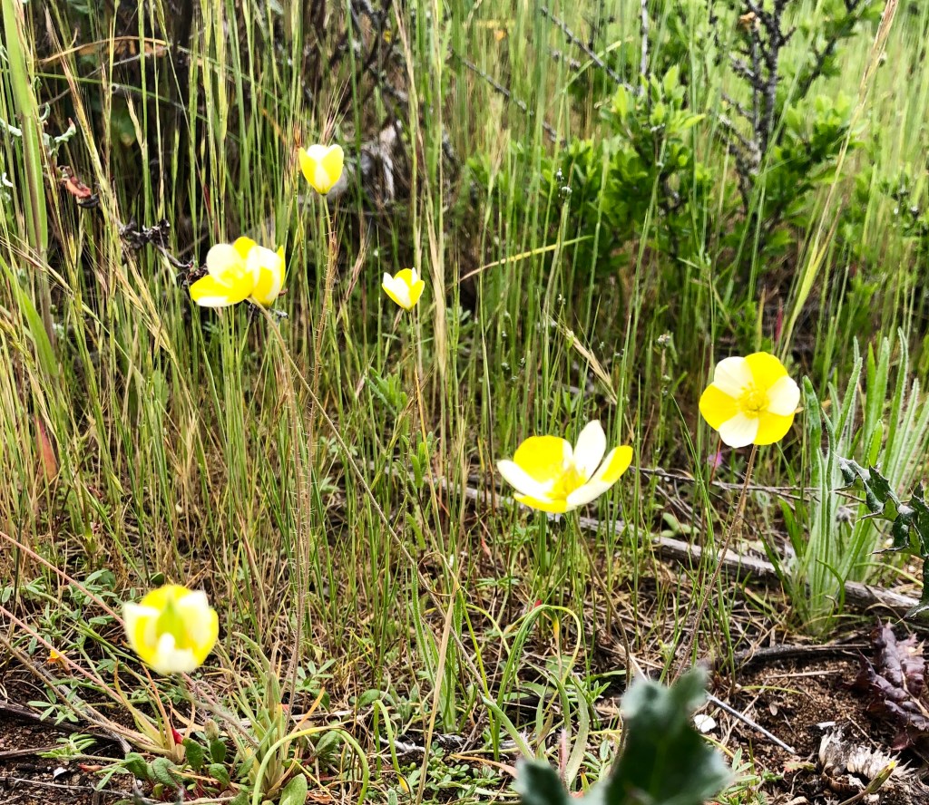 Our lunch spot was along one of these side roads. We pulled out our chairs, a couple of peanut butter and jelly sandwiches, and some fruit. We enjoyed watching some black beetles flying around in the yellow flowers. The weather was perfect. Altogether, a nice lunch.