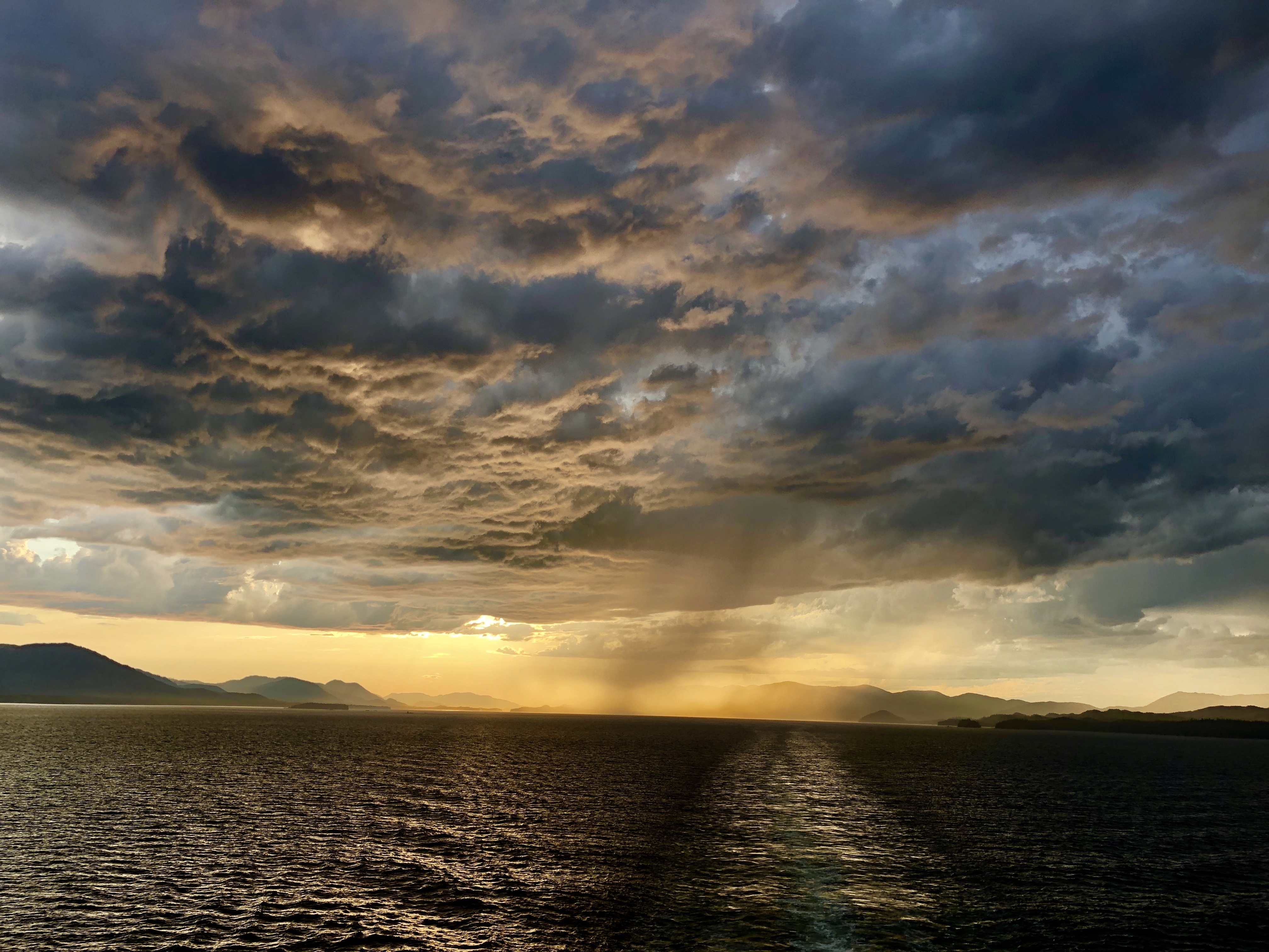 That night it was like Alaska wanted to give us a grand sendoff (tomorrow was really devoted to getting repacked and ready to leave the ship). The storm clouds started gathering and the view off the aft deck was nothing less than spectacular. Every time I turned around the scene changed. It got darker, the wind started to blow, the lightning flashed, and the thunder grumbled. The sun setting behind the clouds and mountains changed the sky colors were always some variation of gold, yellow, orange, red, and dark blue. I will never forget it.