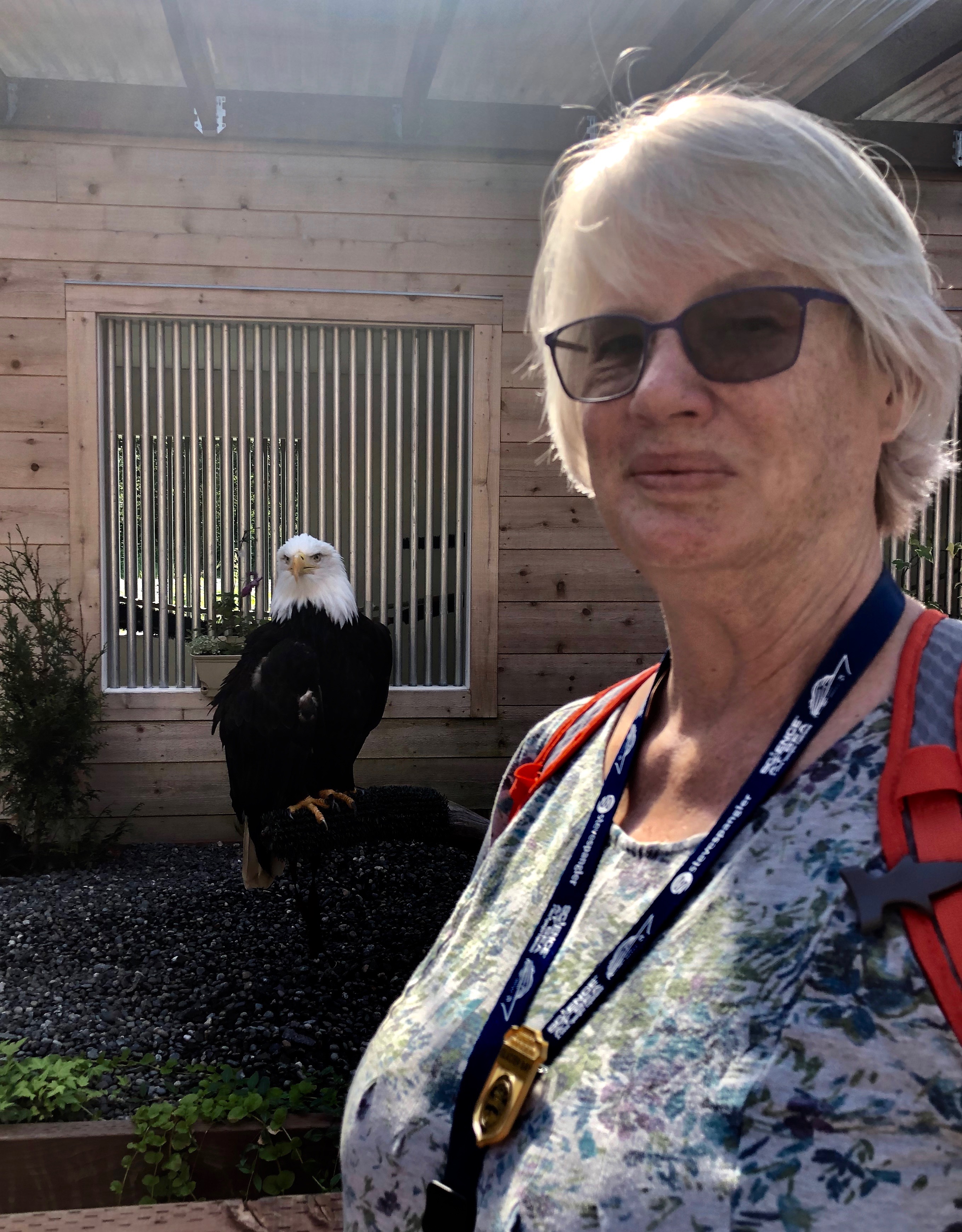 However, it wasn’t rainy today, in fact is was actually sunny and hot, shorts and t-shirts weather. We next arrived along a river bank where there were many bald eagles flying around. I didn’t get any good pictures there, but I did get this picture of Gretchen standing next to a rescued bald eagle that we visited after the hike. We also were able to visit the resident totem pole carver on site and ask him about his work. I’m sorry to say that I didn’t get any pictures there.