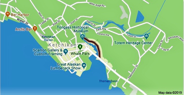 The schedule gave us a few hours free time in town, followed by a trip to the Alaskan Rain Forest Preserve and Raptor Center leaving at 2:30 pm (on the far right of the Ketchikan area image below)..