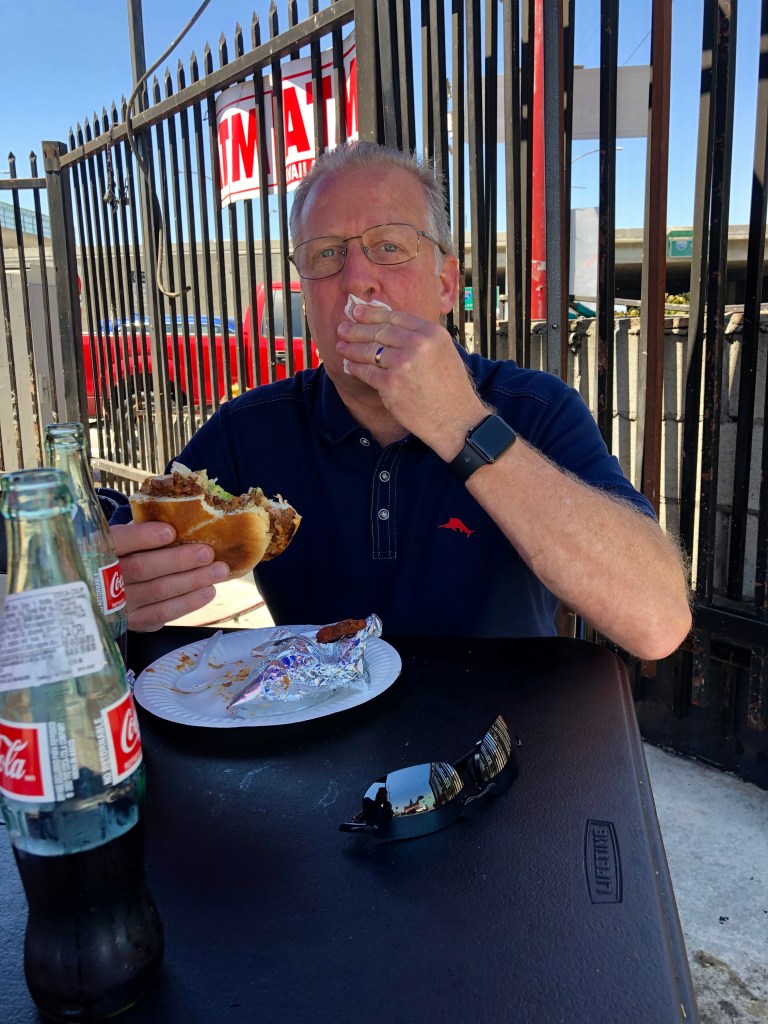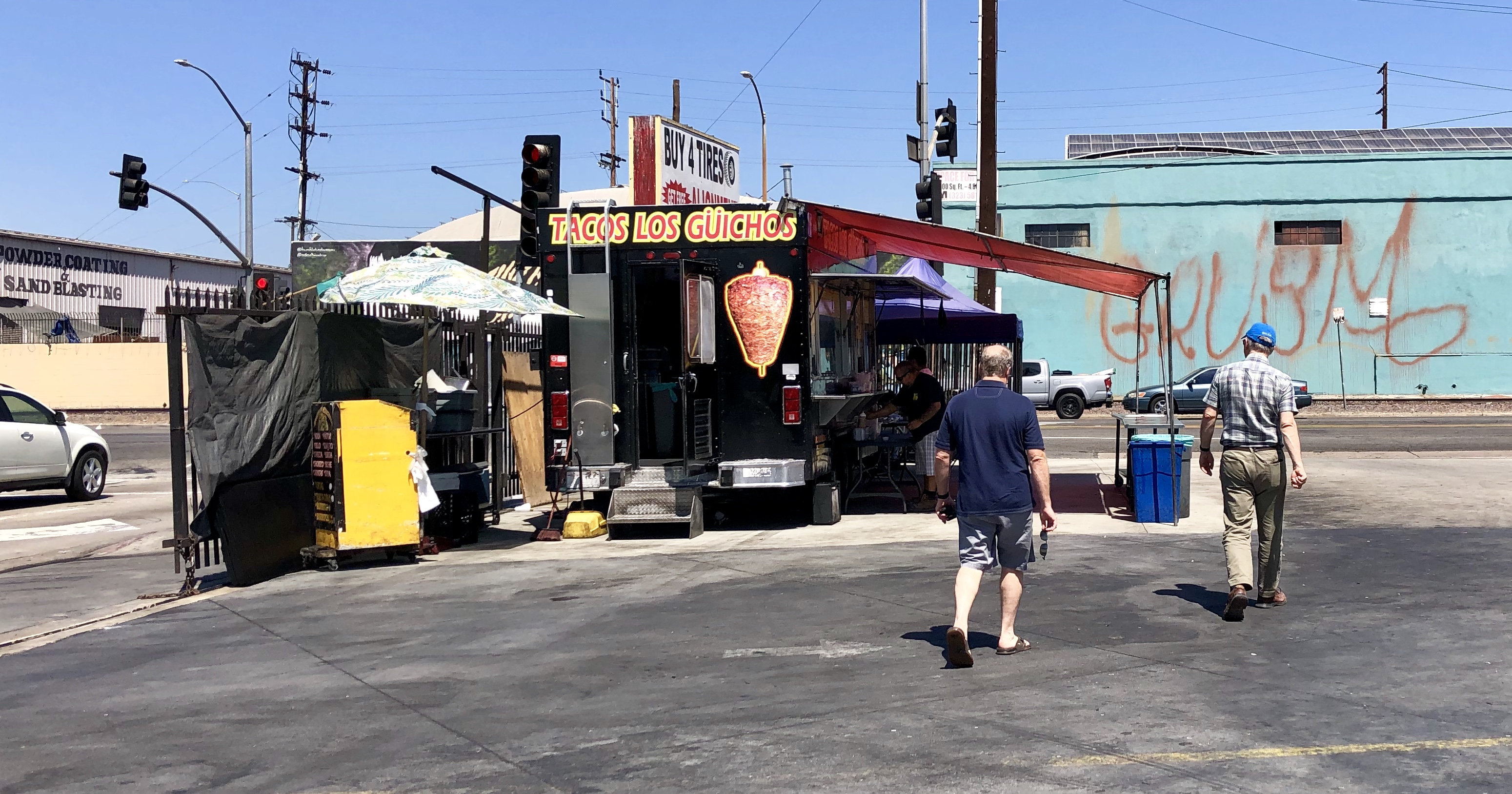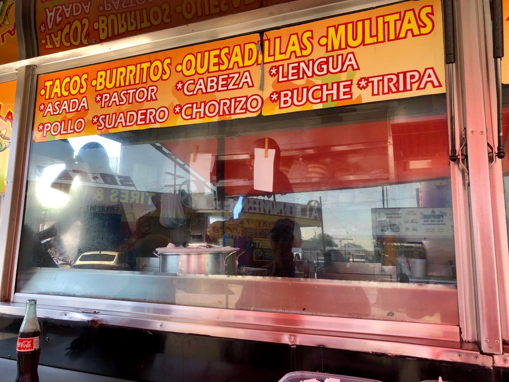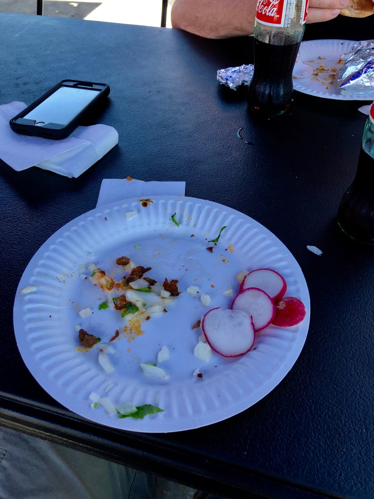 Today we were dining at a folding, shade covered, table to the musical sounds of the nearby freeway, punctuated intermittently by air wrenches removing lug nuts across the parking lot and trucks downshifting for the turn onto Slauson Boulevard. Drawn by the promise of outstanding al pastor tacos, we were not disappointed.