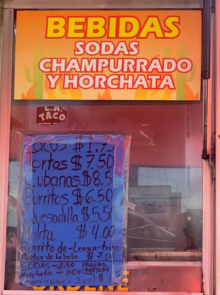 We swung off the 110 freeway, negotiated the turn onto Slauson, and immediately turned into the parking lot. It seems that the tire store allows Tacos Los Guichos patrons to park in their lot, but since were were no signs, it is hard to tell. We ended up double parked behind another car.