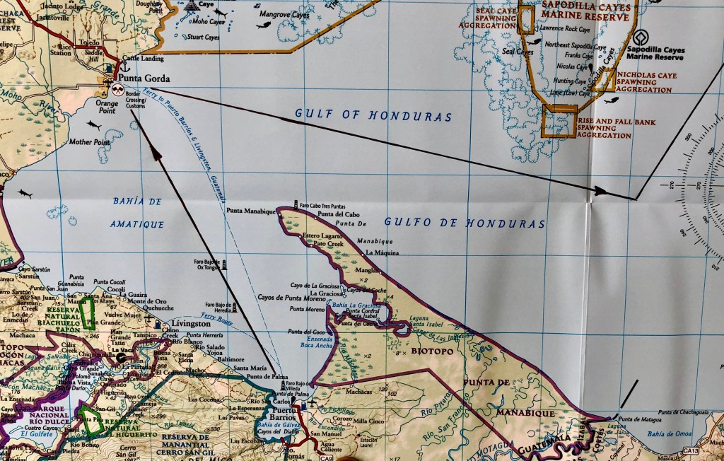 The ship and crew however had a long night ahead of them. from Puerto Barrios, the ship would head northwest to the Belizian port of Punta Gorda where we would officially pass through customs and enter the country. From there the ship would head east, and then turn northeast once outside Belize’s famed barrier reef.