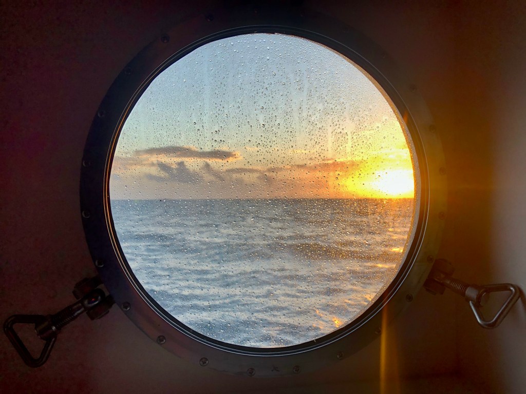 I woke to the sound of waves slapping the hull outside my lower deck porthole, and the constant drone of the engines. My bed was rolling sufficiently to require some concentration to stay on top. Concerned that I might be getting seasick, I decided to go up to the lounge to investigate.