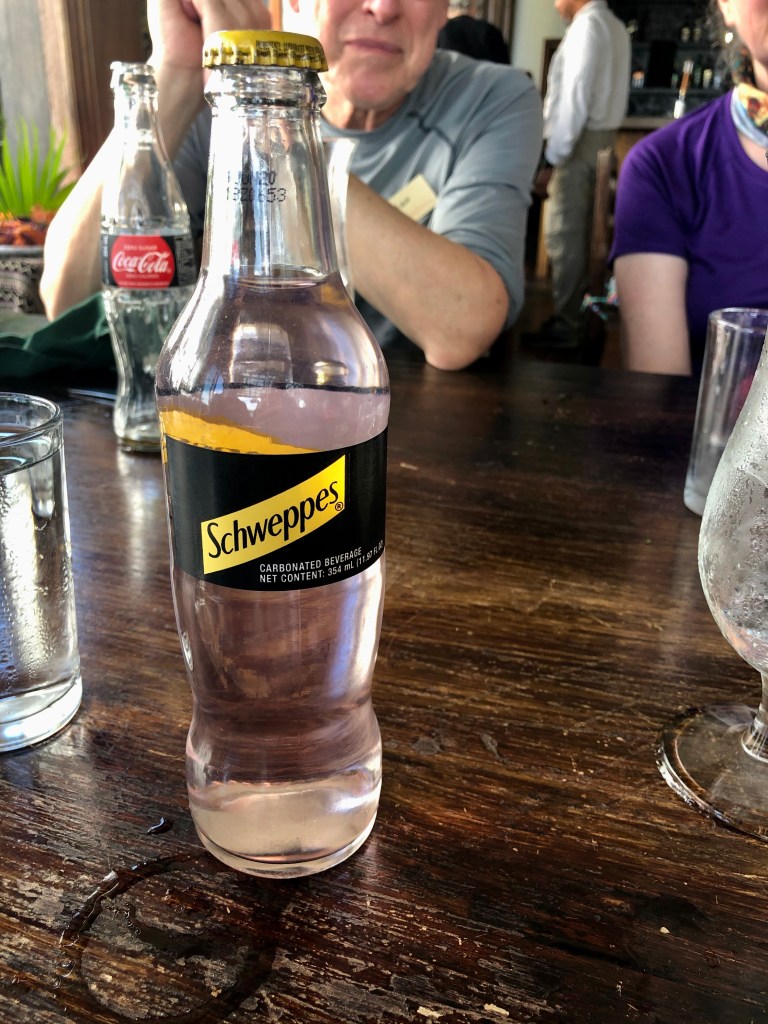 Confused, I asked the waitress to verify that it was indeed a G&T. She looked at me as if I was a little slow, and replied that it was the right concoction. turns out that the only bottler in Belize colors their tonic pink. I verified that this was still true by asking the bartender for a bottle while we ate lunch.