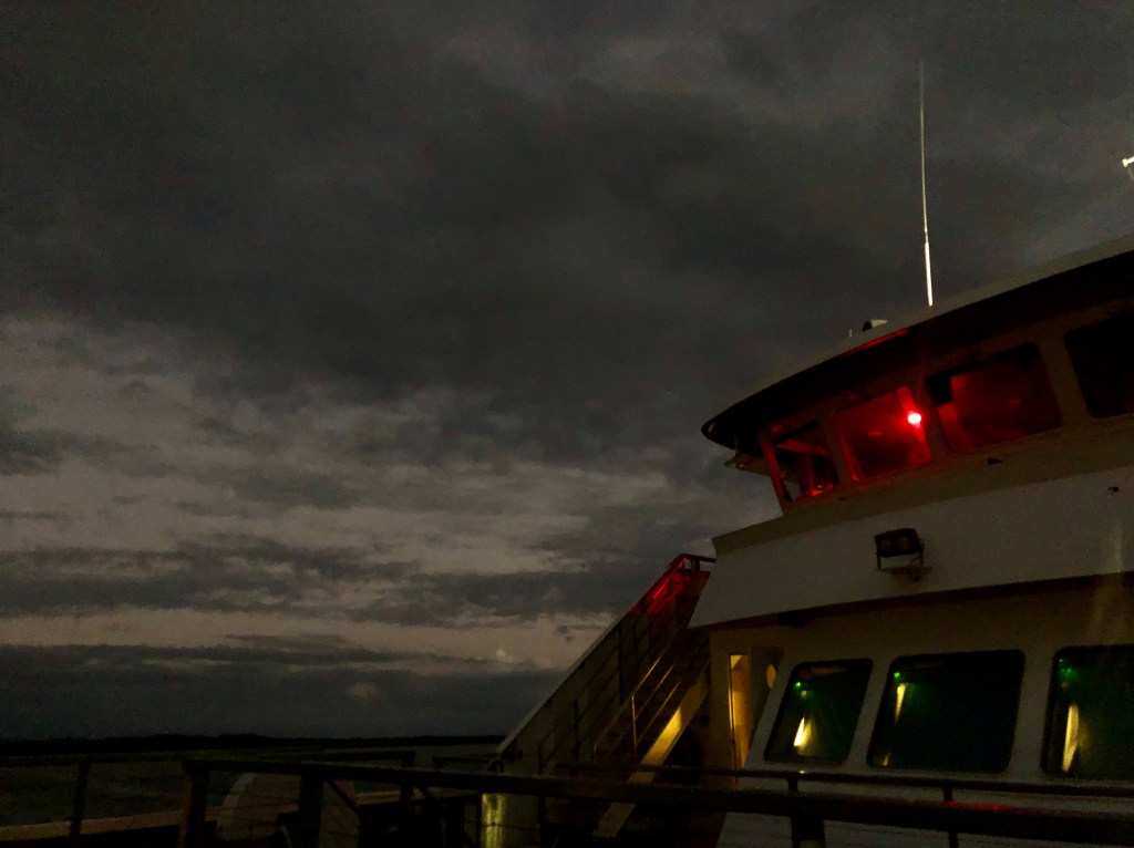 Inside the bridge, everything was dark, except for the glow of the red light allowing the crew better night visibility. The temperatures were warm in spite of the threatening rain.