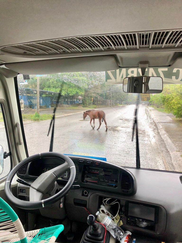 Disembarking was pretty straightforward. We only had our carry-ons, the rest of the luggage had been transported separately to the airport in Guatemala City. We had to repeat the customs process in reverse order to enter Guatemala that we went through when we first arrived. Including the small customs office where I took this picture of the horse wandering across the road while we were waiting to get everyone checked in.