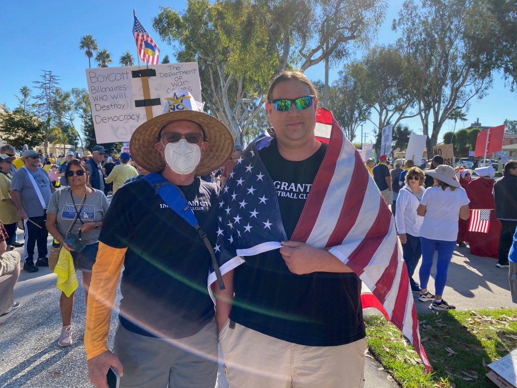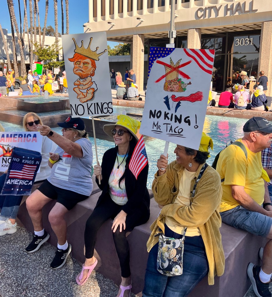 The No Kings Protest in Torrance CA on 10/18 was a hoot. My wife Gretchen, my son Darwin, and I had a great time hanging out with several thousand patriotic Americans on a beautiful fall day. We made a late decision to attend and made it to the event without any trouble. There was no evidence of America Hating protesters. Maybe they were all listening to Trump on truth social. But they weren’t here.