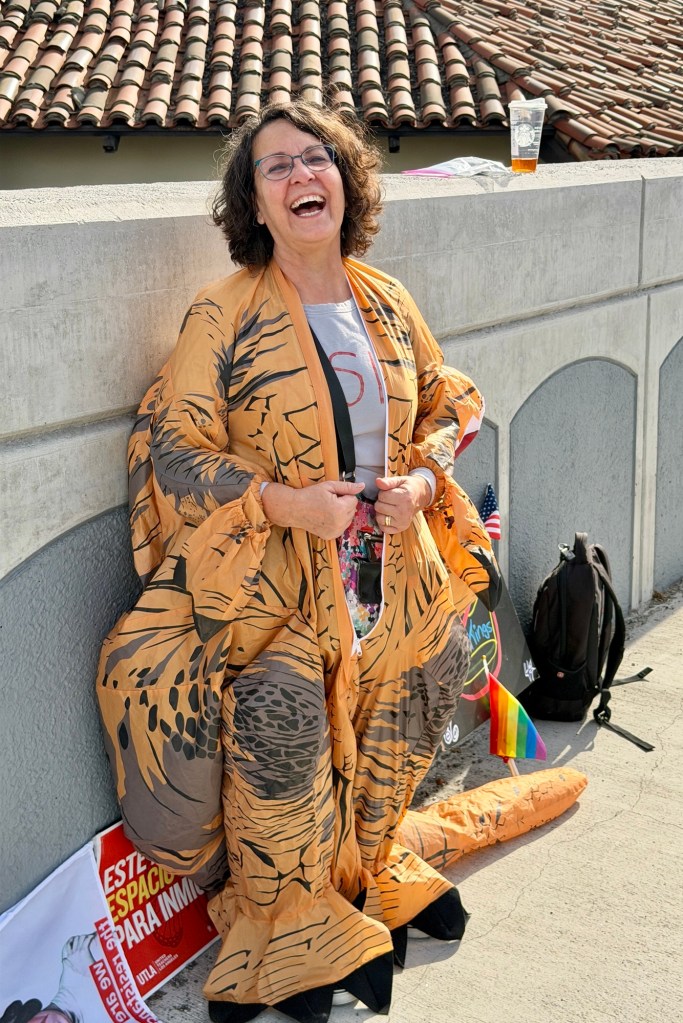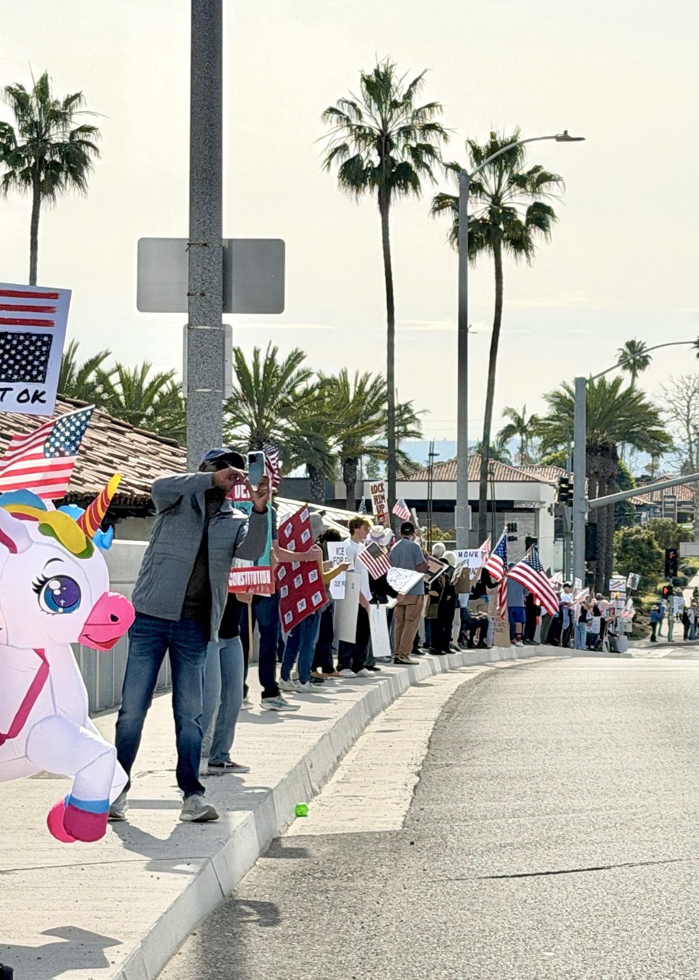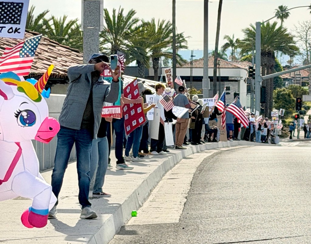 Postscript – Today I participated in a weekly Anti-Trump demonstration with about 200 other people and inflatable creatures. We danced to the music provided by the inflatable frog. We waved signs at passing cars. We encouraged drivers to honk and wave.